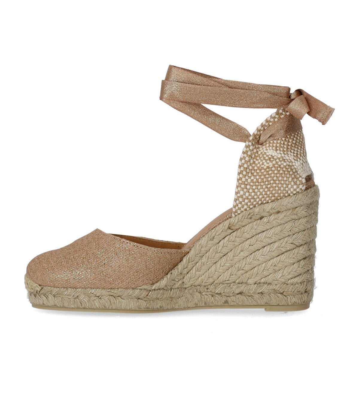 Carina espadrille by Castañer made of canvas and lurex thread in shades of pink and gold. Leather lining and insole, matching laces to tie at the ankle and rubber sole. Wedge height 9 cm with 2 cm platform.