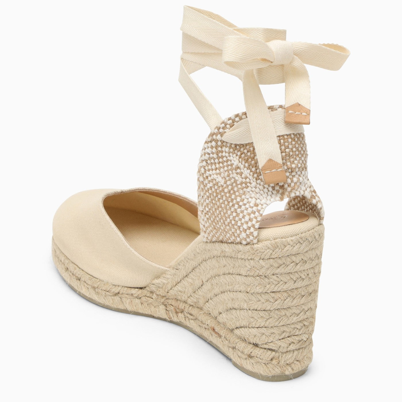 Handcrafted high espadrilles by Castañer made from ivory cotton upper featuring branded insole, round toe, tie-fastening ankle strap and natural-coloured raffia wedge heel.