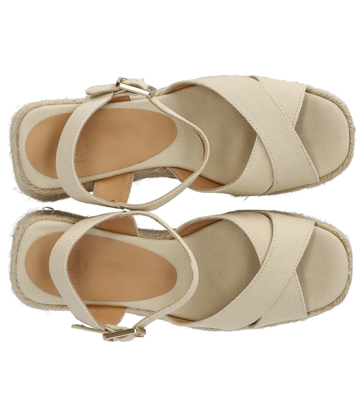 Castañer Thea sandal made of ivory colored cotton canvas, featuring crossed straps on the front and ankle strap closure. Leather lining and rubber sole, 8 cm wedge height with 2 cm plateau. External composition: 100% cotton. Internal composition: 100% leather.