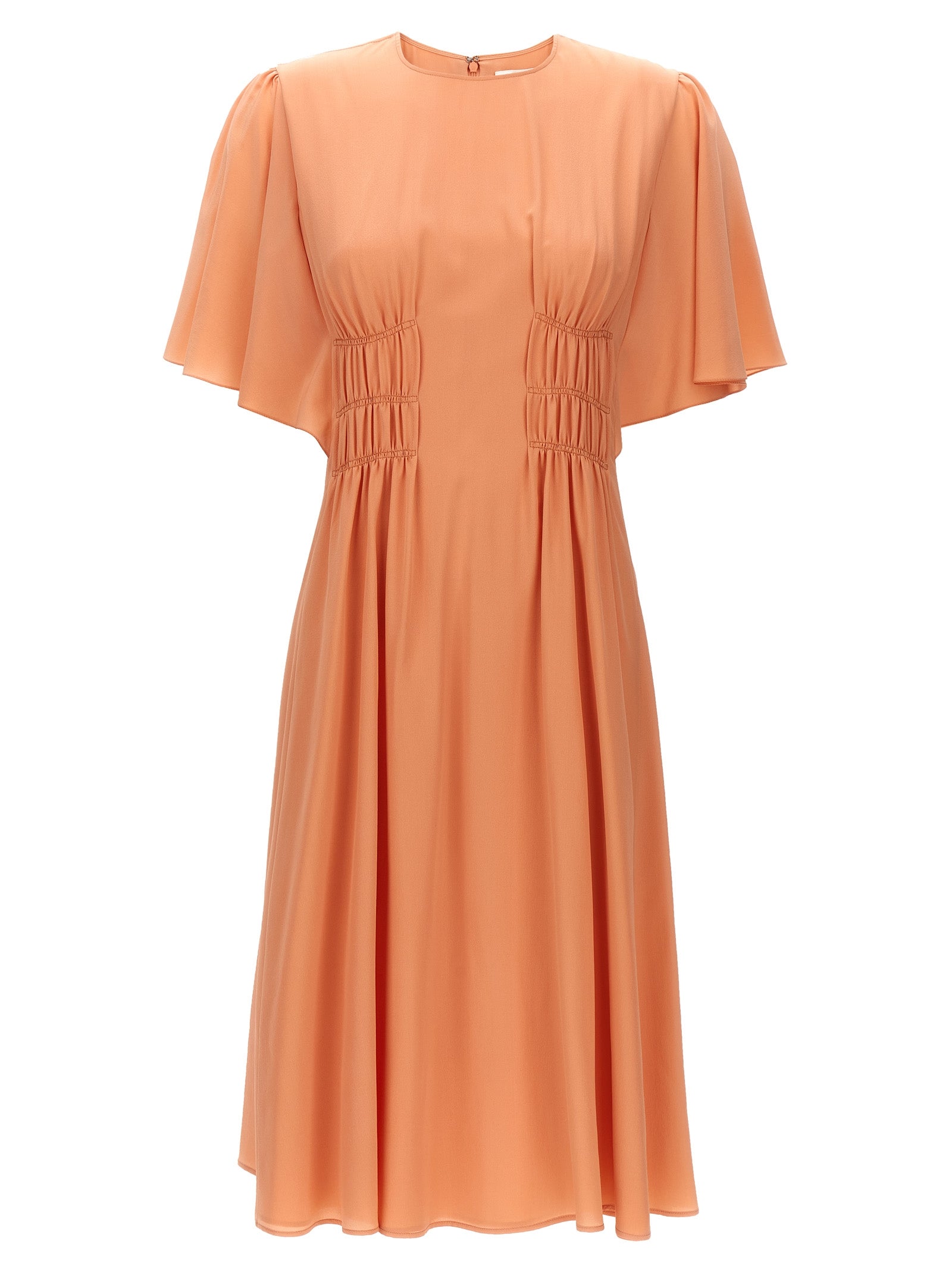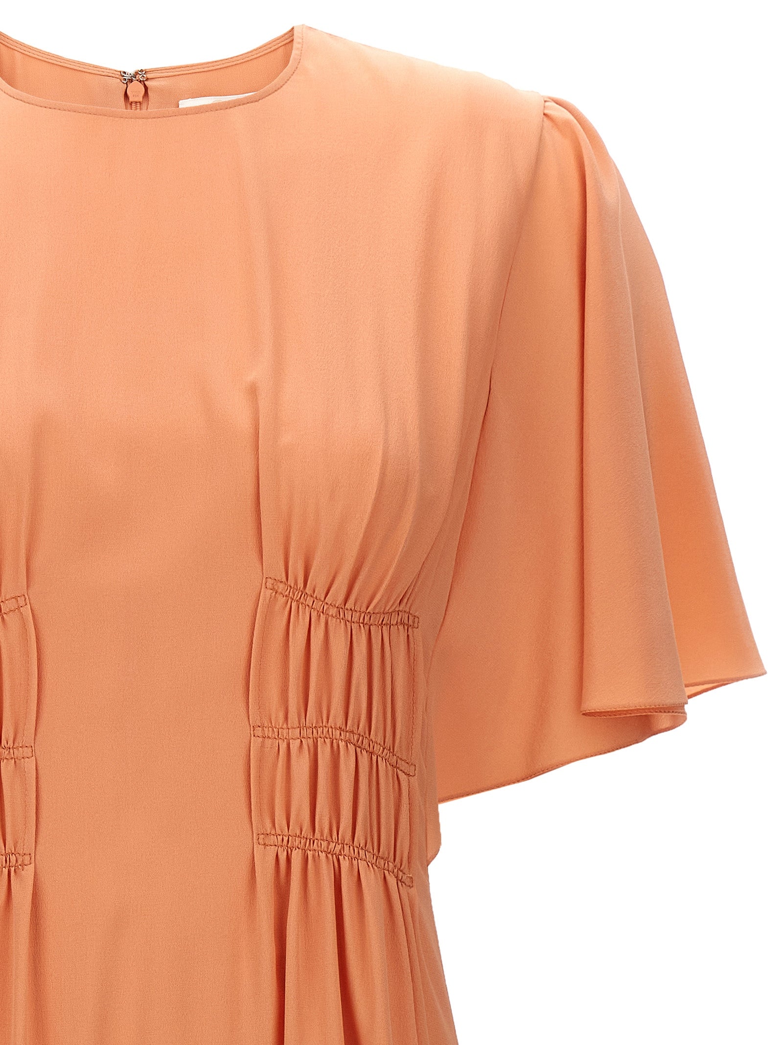 Midi silk dress with crinkled waist, short and wide sleeves, crew neck.