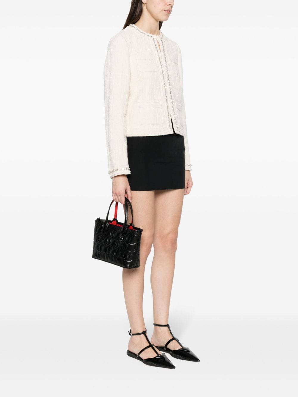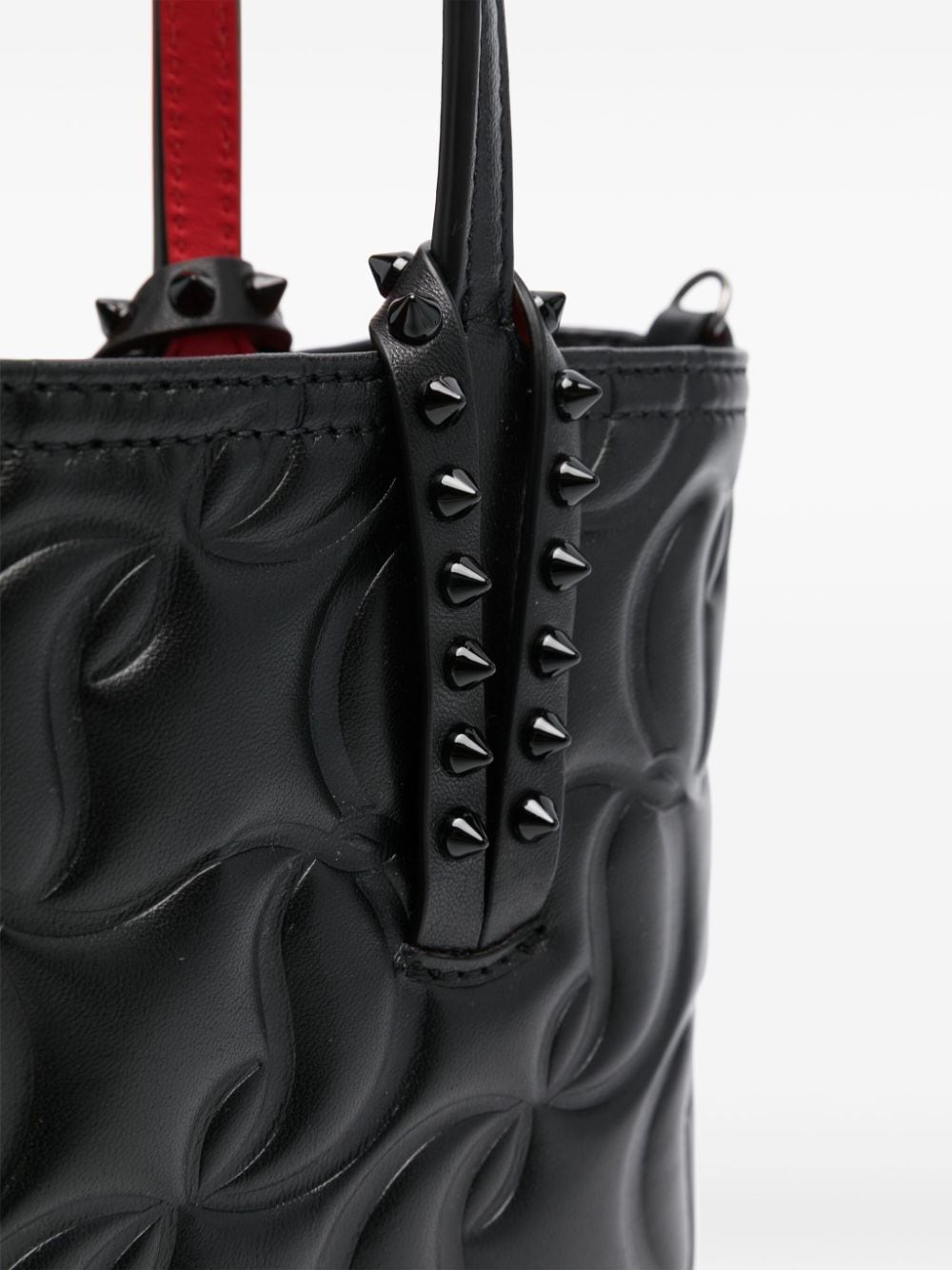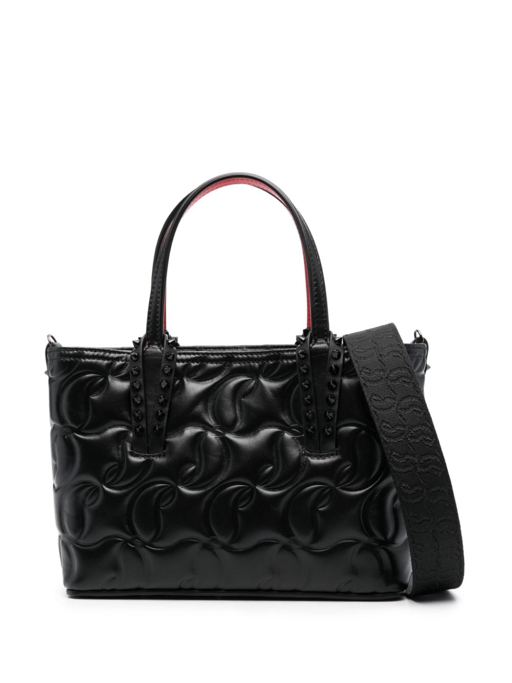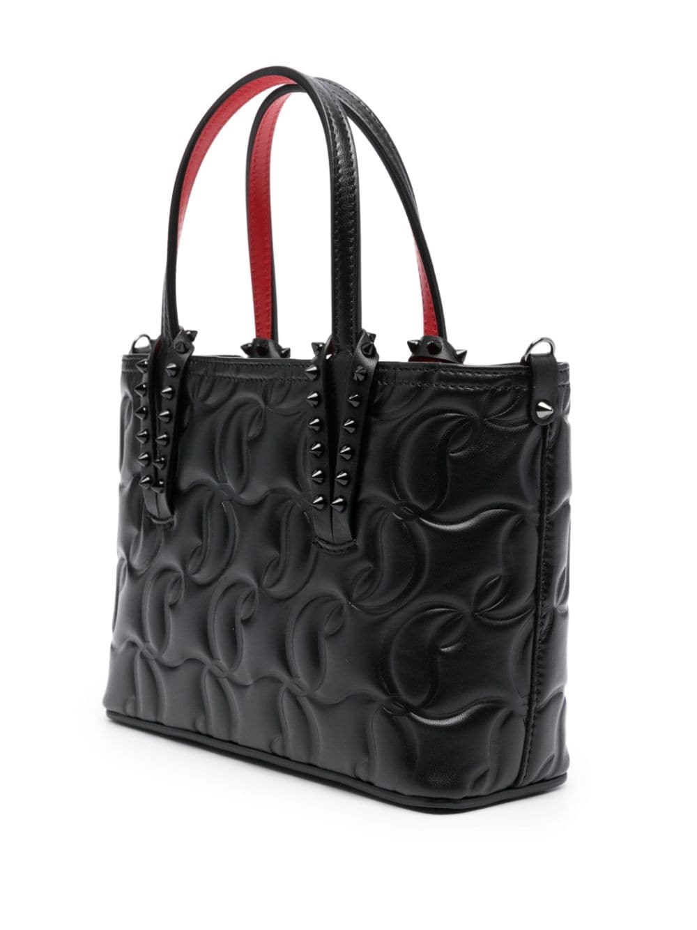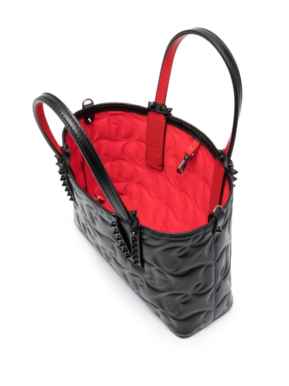 black/red nappa leather debossed monogram pattern spike stud detailing logo-engraved silver-tone hardware debossed logo to the bottom lobster claw fastening two flat top handles adjustable detachable logo-jacquard shoulder strap main compartment