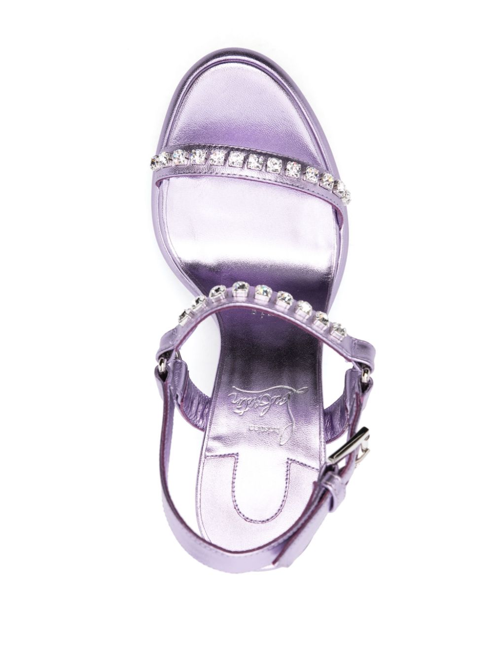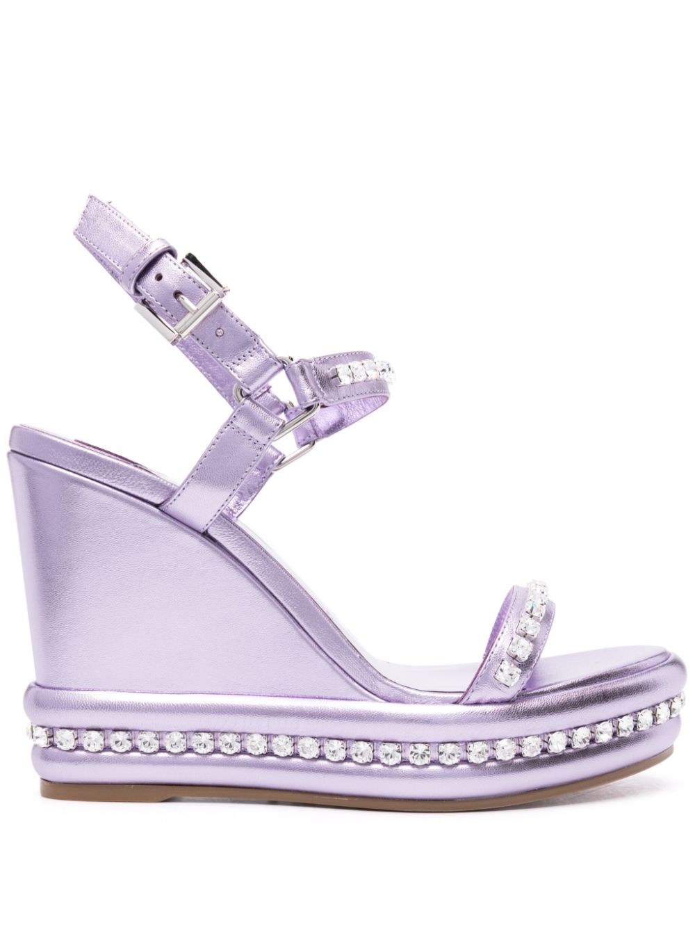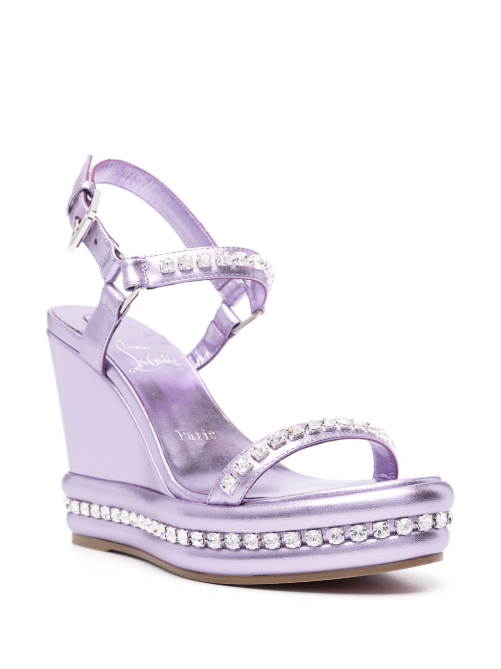 light purple calf leather smooth grain metallic effect glass crystal embellishment round open toe buckle-fastening ankle strap branded leather footbed 110mm high wedge heel signature red sole rubber outsole