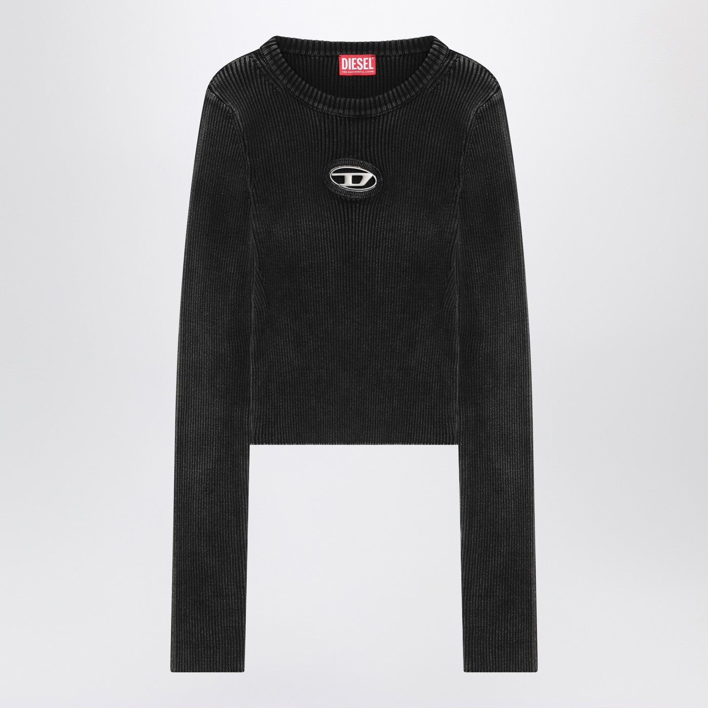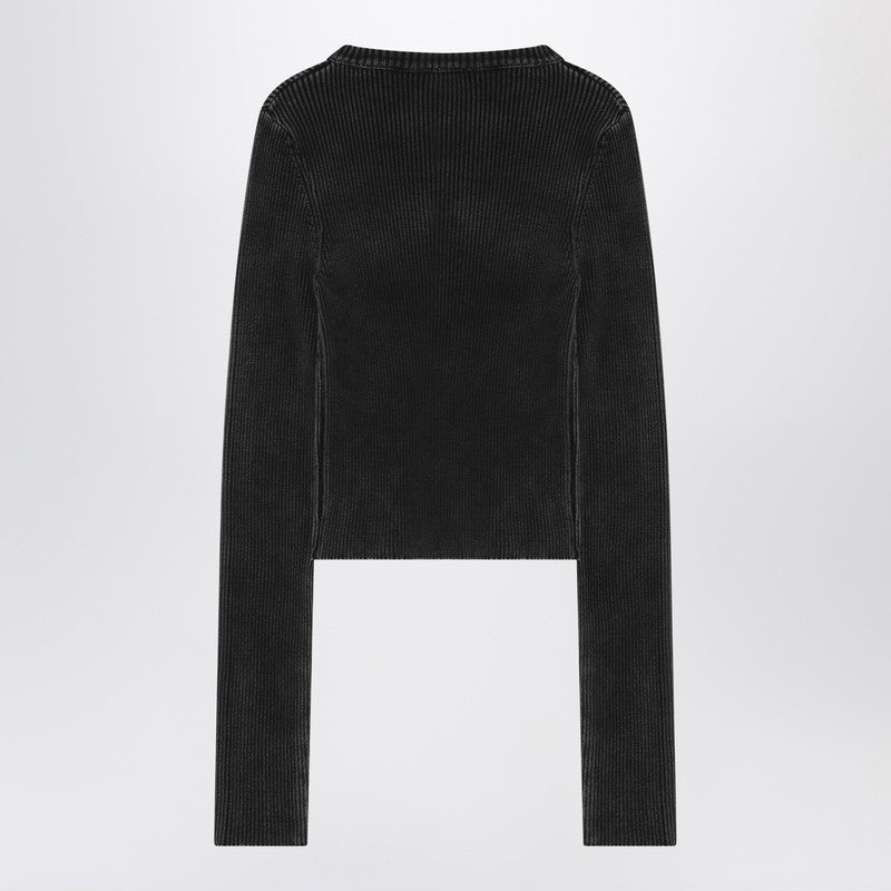 Black washed-out stretch cotton crew-neck T-shirt from Diesel featuring long sleeves, a ribbed design, a metal Oval D plaque on the chest and a slim fit.