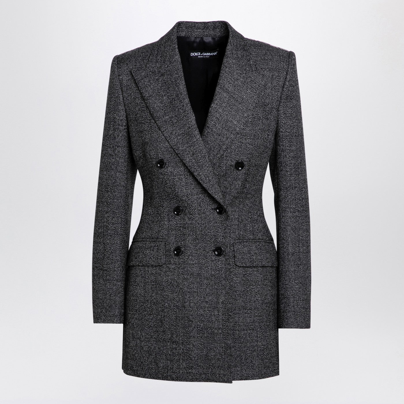 Double-breasted jacket by Dolce & Gabbana in anthracite grey wool tweed featuring peaked lapels, front button placket, front flap pockets, long sleeves, buttoned cuffs and a central back vent.