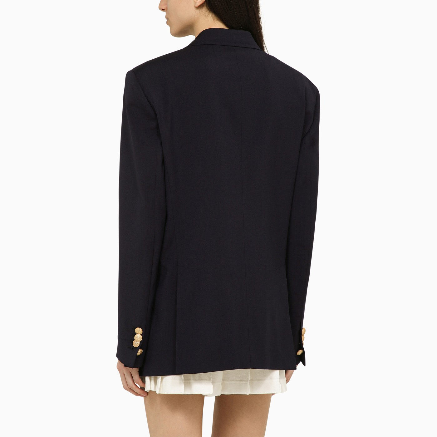 Navy blue wool double-breasted jacket from Dsquared2 featuring peaked lapels, a gold-tone button front fastening, a welt pocket on the chest, three flap pockets on the front, long buttoned sleeves and a double back vent.