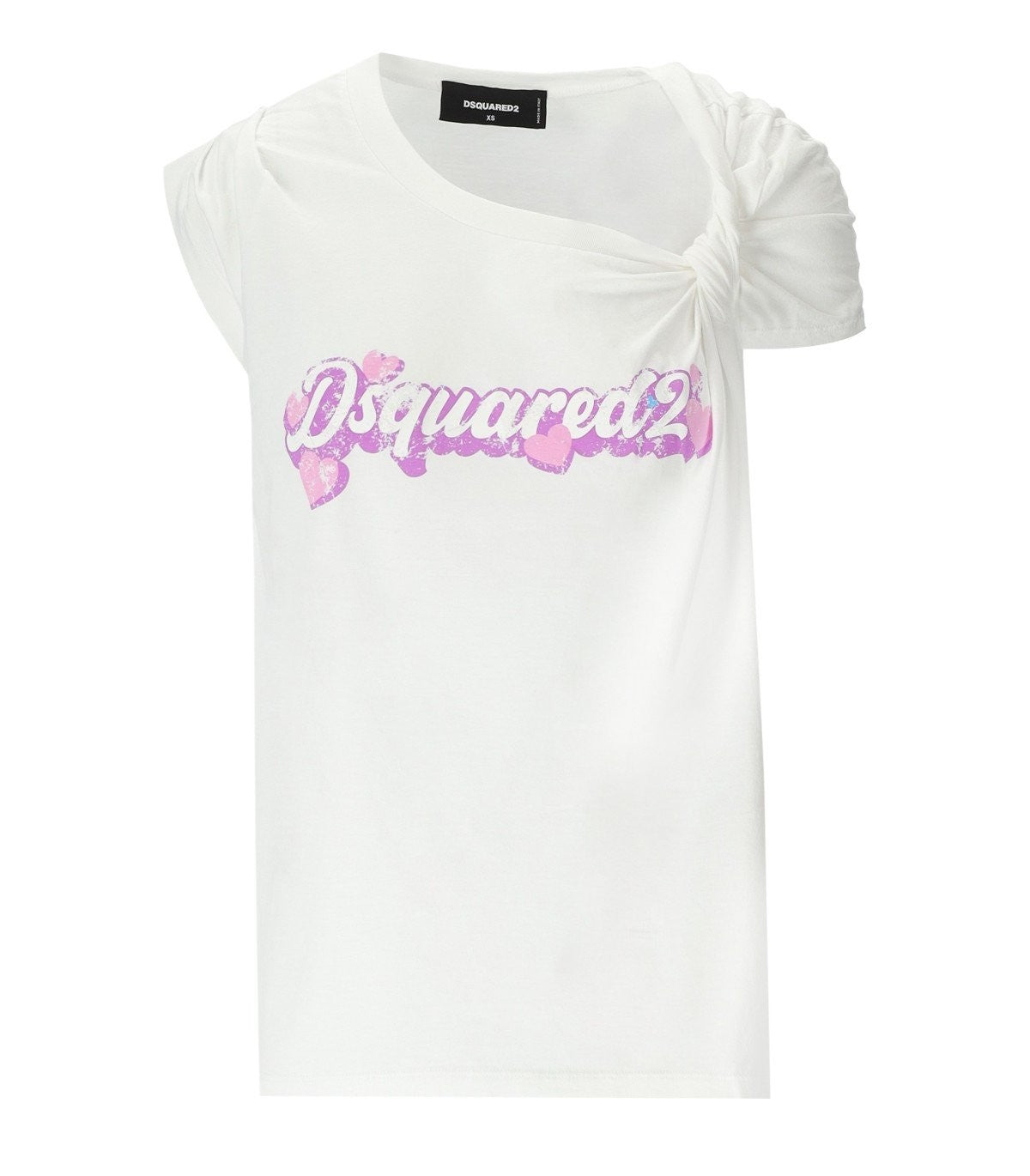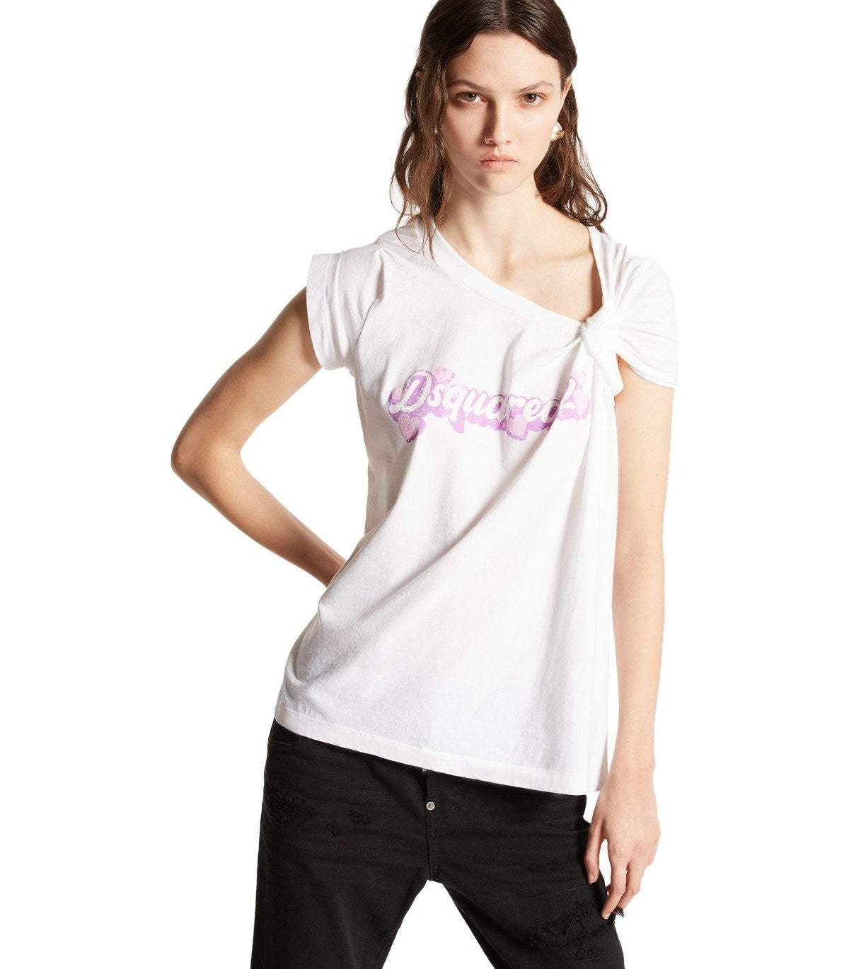 Dsquared2 T-shirt made of white cotton jersey, decorated with a pink logo and an asymmetrical neckline with a knot. Regular fit. Composition: 100% cotton.