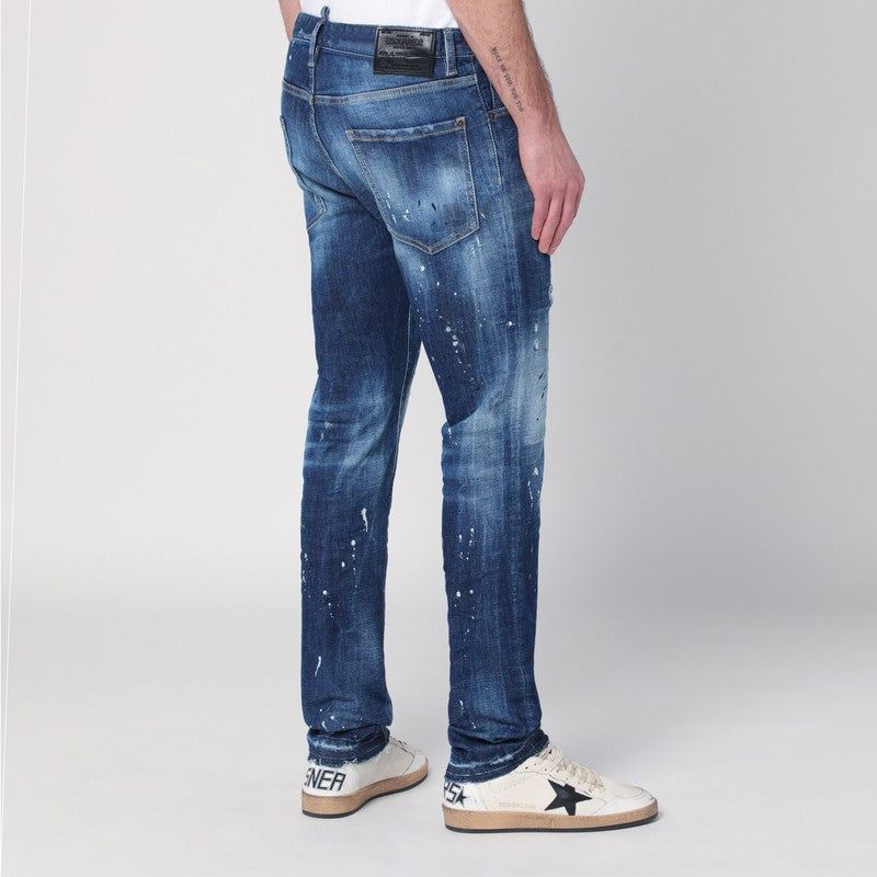 Dsquared2 jeans in blue cotton denim with a faded effect, characterized by a front closure with button and zip, belt loops, five classic pockets, back logo patch, localized rips, splatter details, and front logo tag.