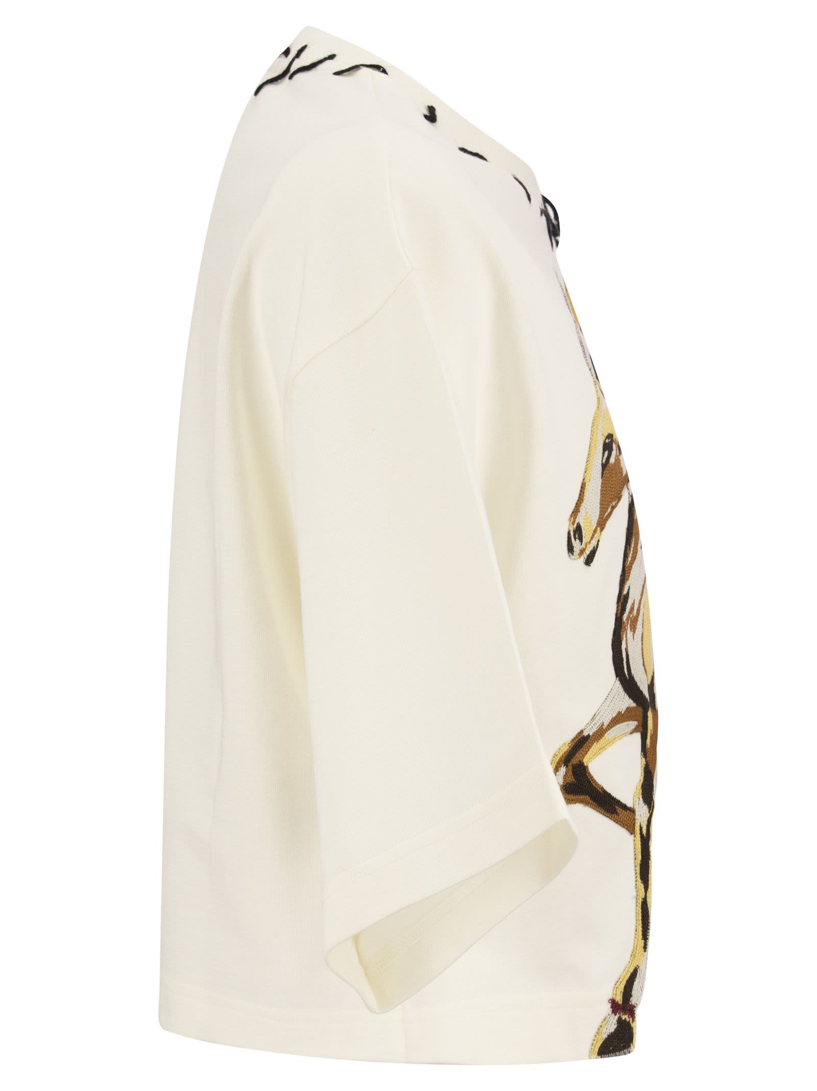 Cropped T-shirt from the Autumn Winter 2022 Women's Fashion Show collection, embellished with the Pegasus, the winged horse symbol of the Maison, created in a figurative style with yarn-dyed embroidery. The T-shirt features contrast stitching with tassels and a contrasting ETRO CUBE logo on the back. - Short fit DESIGNER ID: 13581 9540 0990
