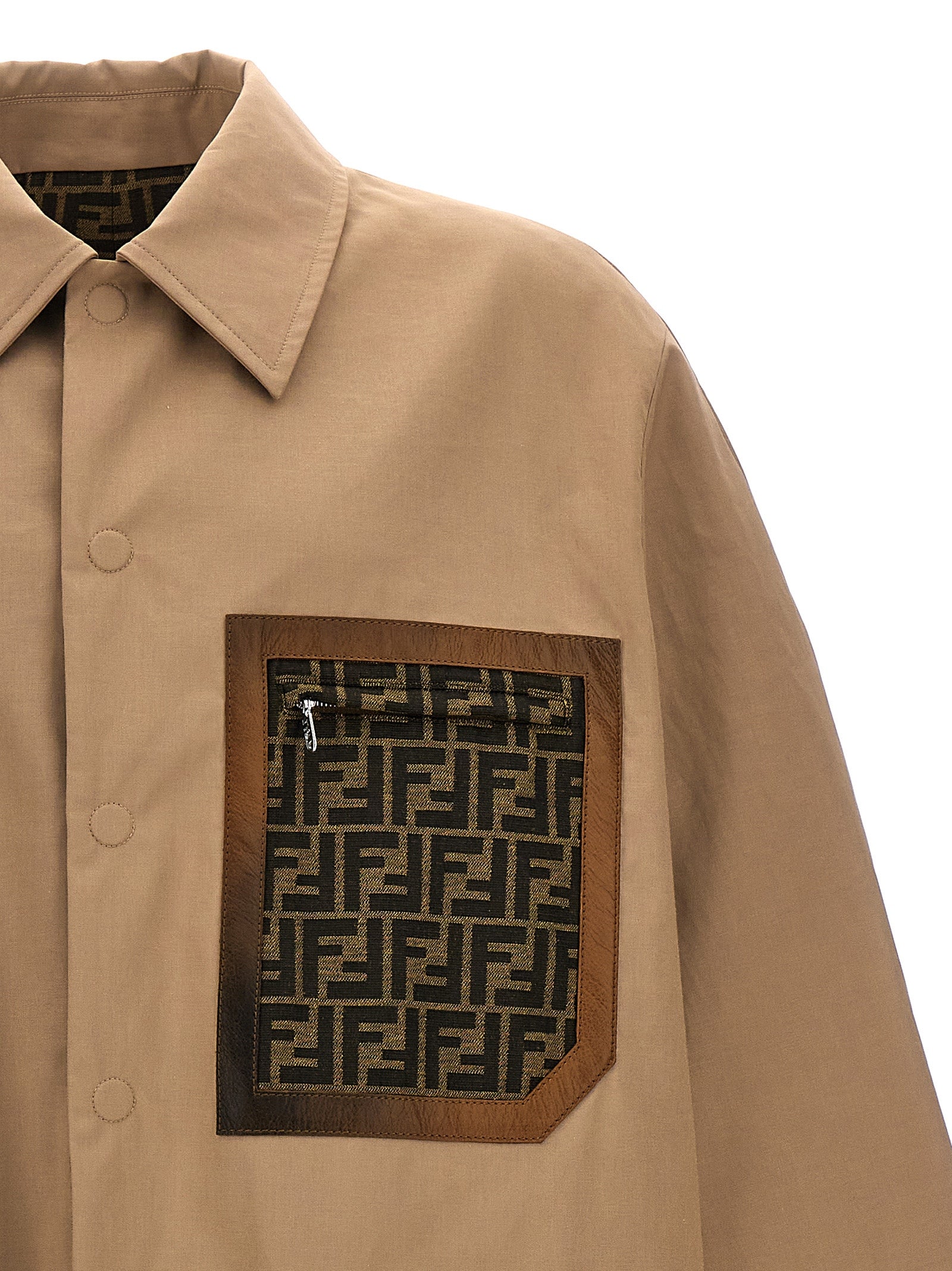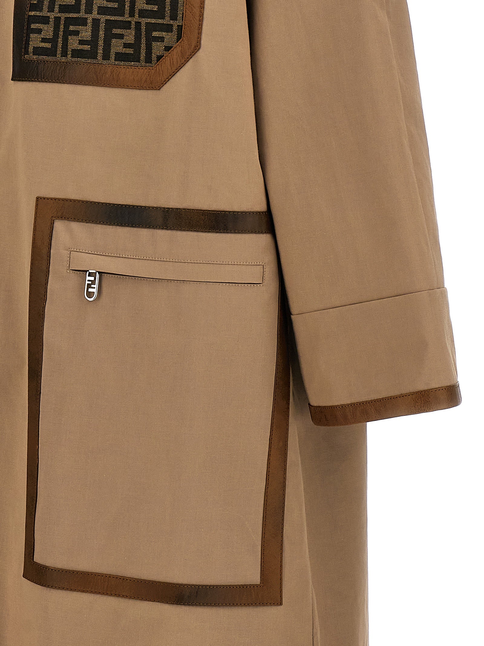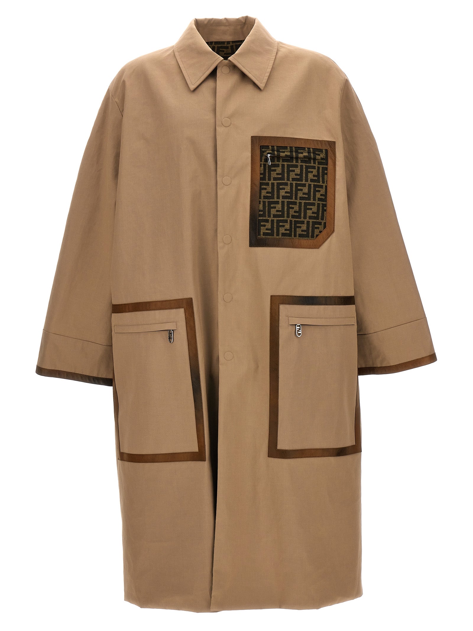 'FF' long reversible trench coat with covered snap button closure. One side is in solid color fabric with contrasting piping and logo chest pocket, the other side is all-over logo.