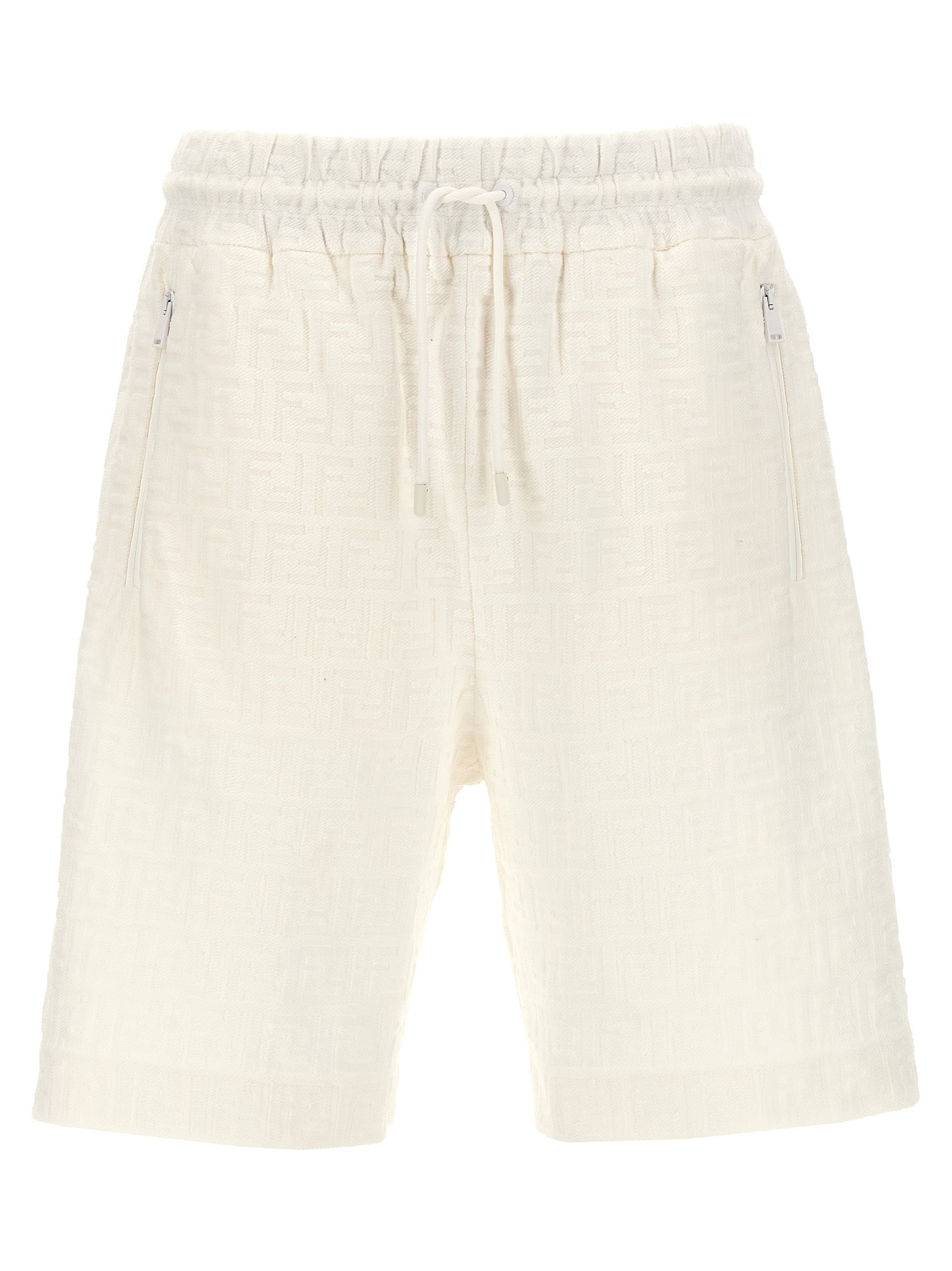 Jacquard cotton bermuda shorts with all-over logo, drawstring elastic waistband, tonal zip pockets.