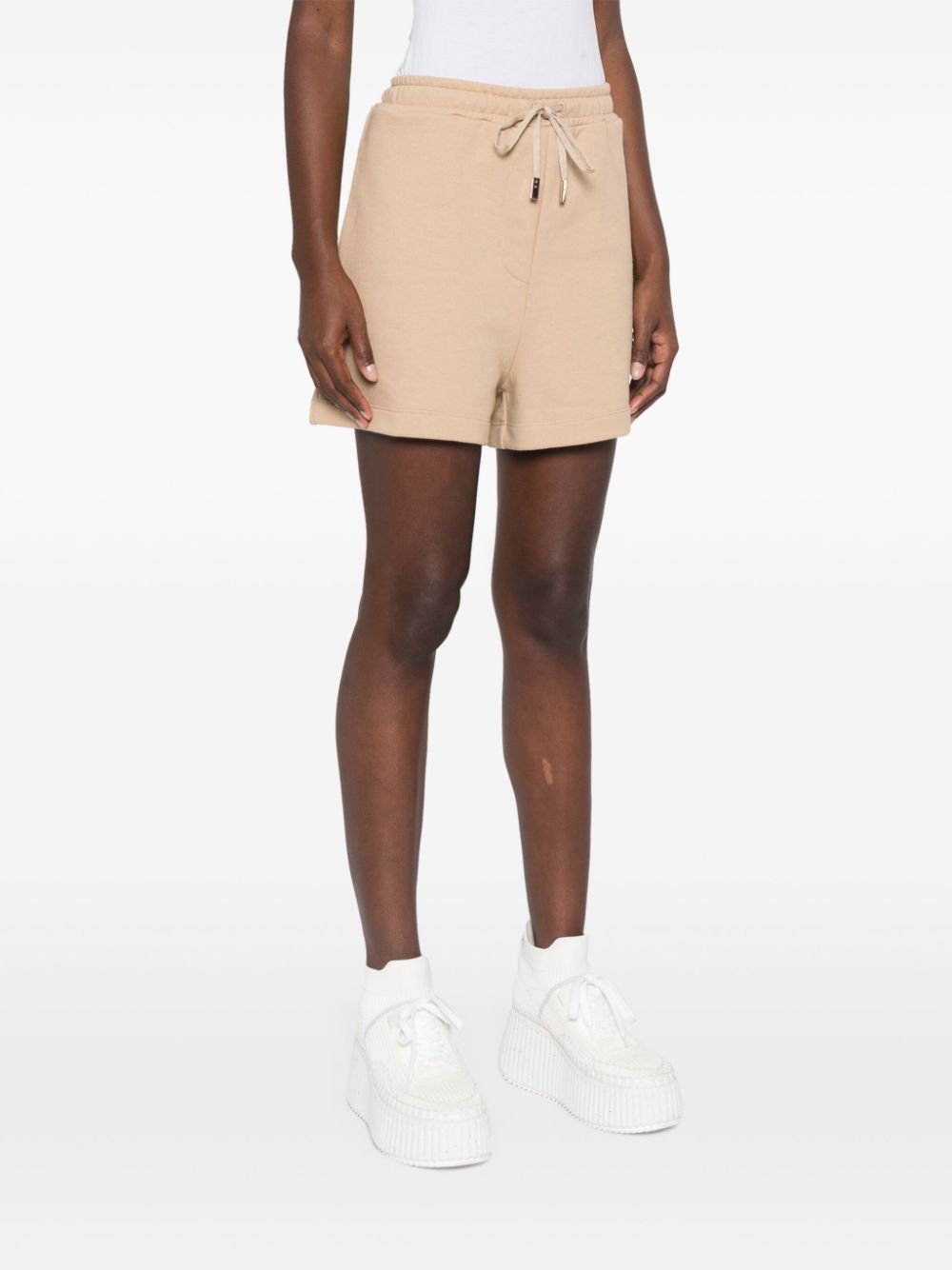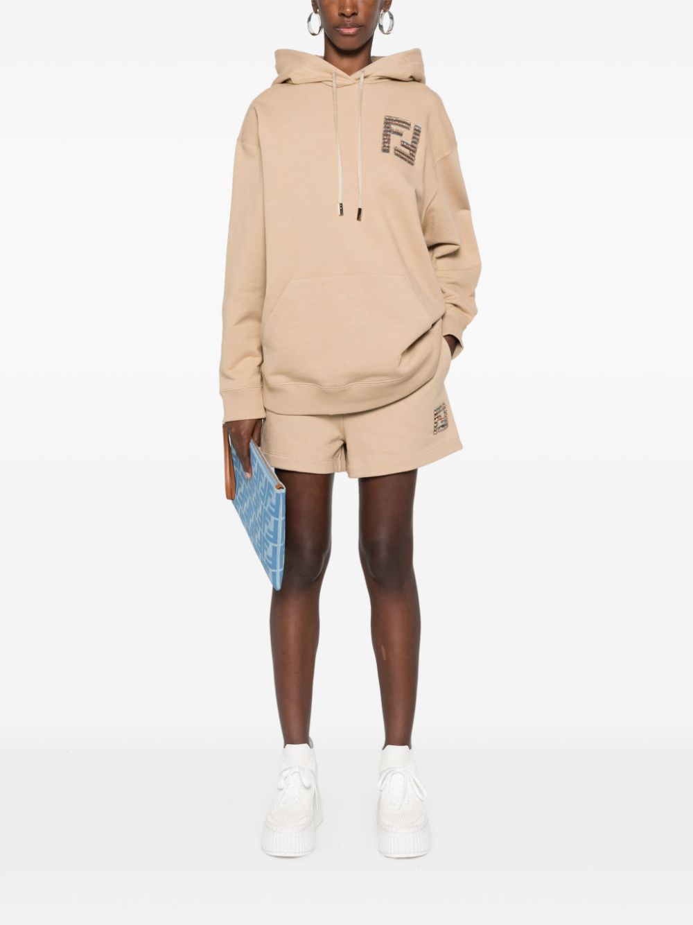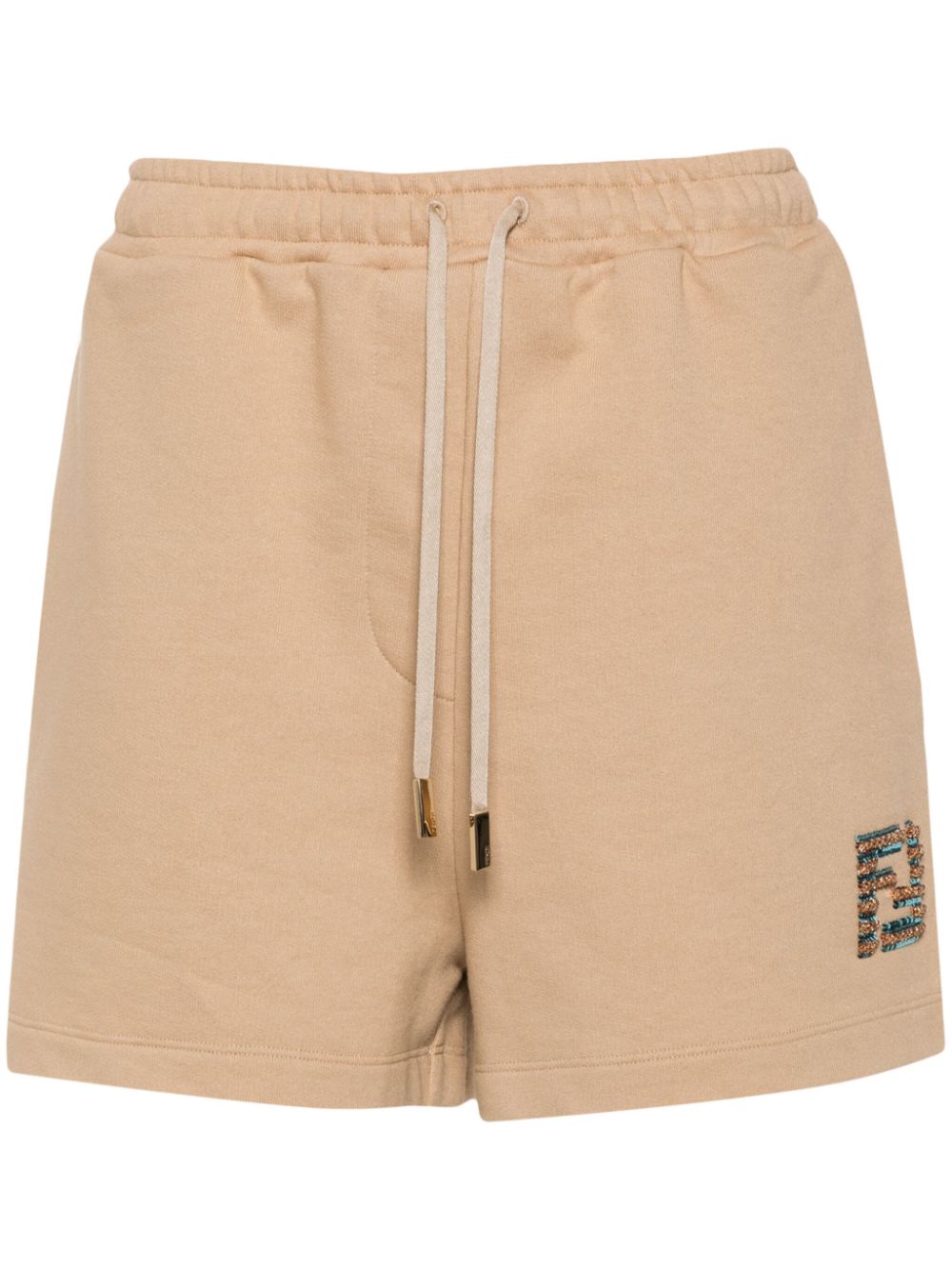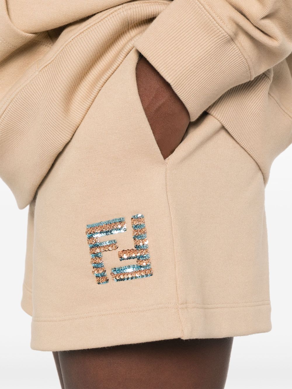 sand beige cotton jersey texture FF motif sequin embellishment high-waisted elasticated drawstring waistband two side slit pockets thigh-length