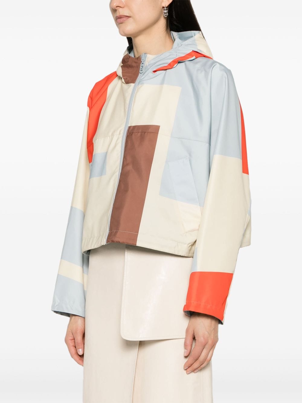 light blue/multicolour reversible geometric-pattern print logo print at the chest drawstring hood stand-up collar long sleeves two side slit pockets drawstring hem front zip fastening