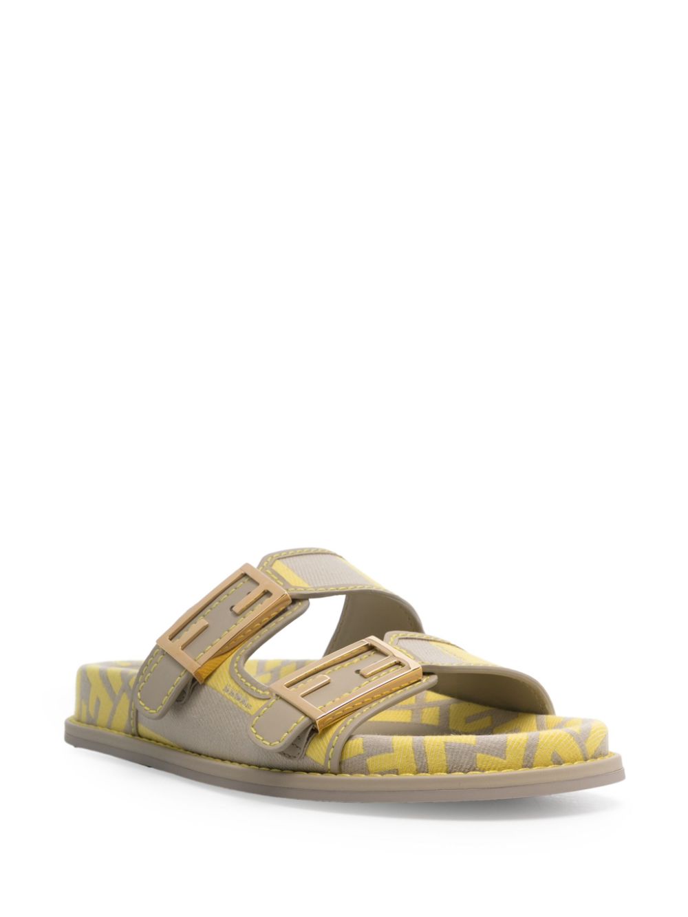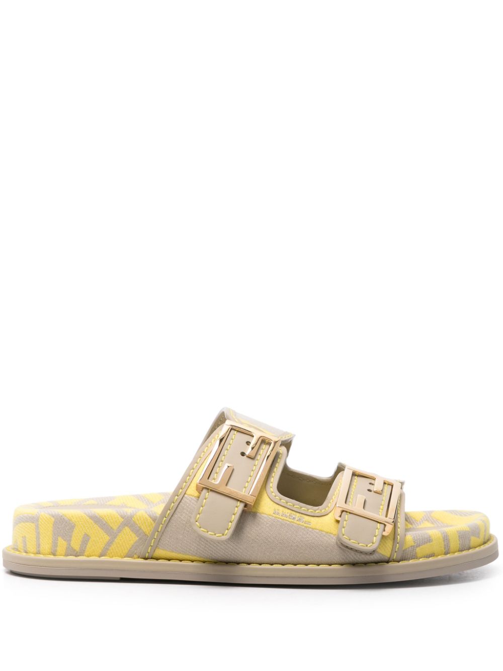 beige/yellow cotton/canvas leather trim jacquard FF motif almond open toe cut-out detailing branded insole rubber sole gold-tone hardware two buckle-strap fastenings