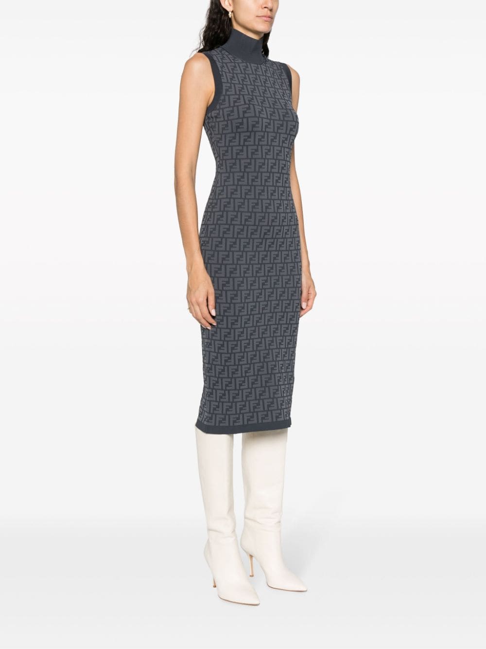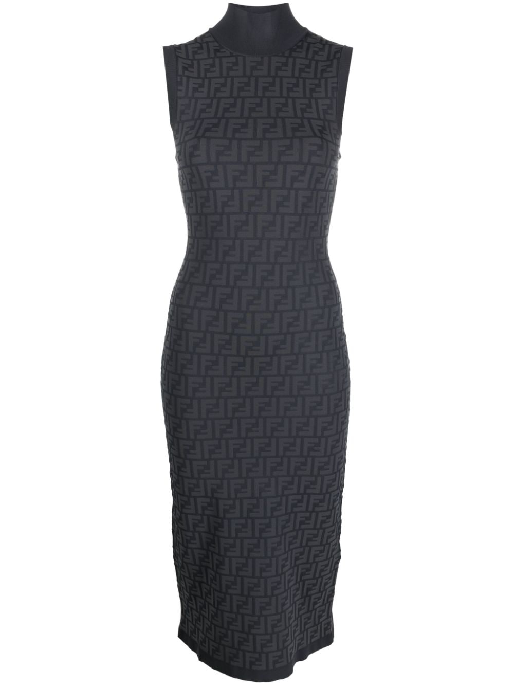 FF-intarsia knit ribbed-knit midi dress from FENDI featuring medium grey, anthracite grey, stretch-design, ribbed knit, FF motif, patterned intarsia knit, ribbed-knit edge, funnel neck, sleeveless, fitted waistline, straight hem and mid-length.