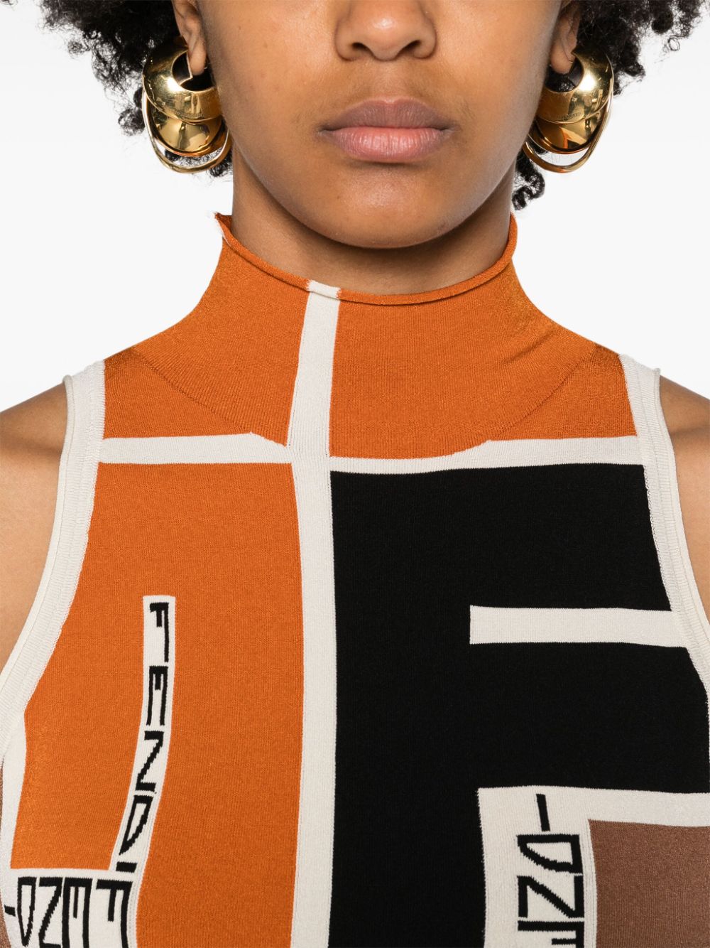 orange/multicolour colour-block design intarsia-knit logo high neck sleeveless raw-cut hem thigh-length unlined