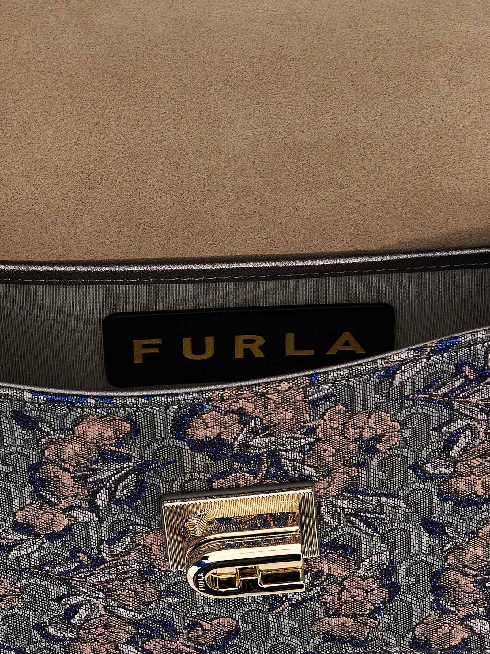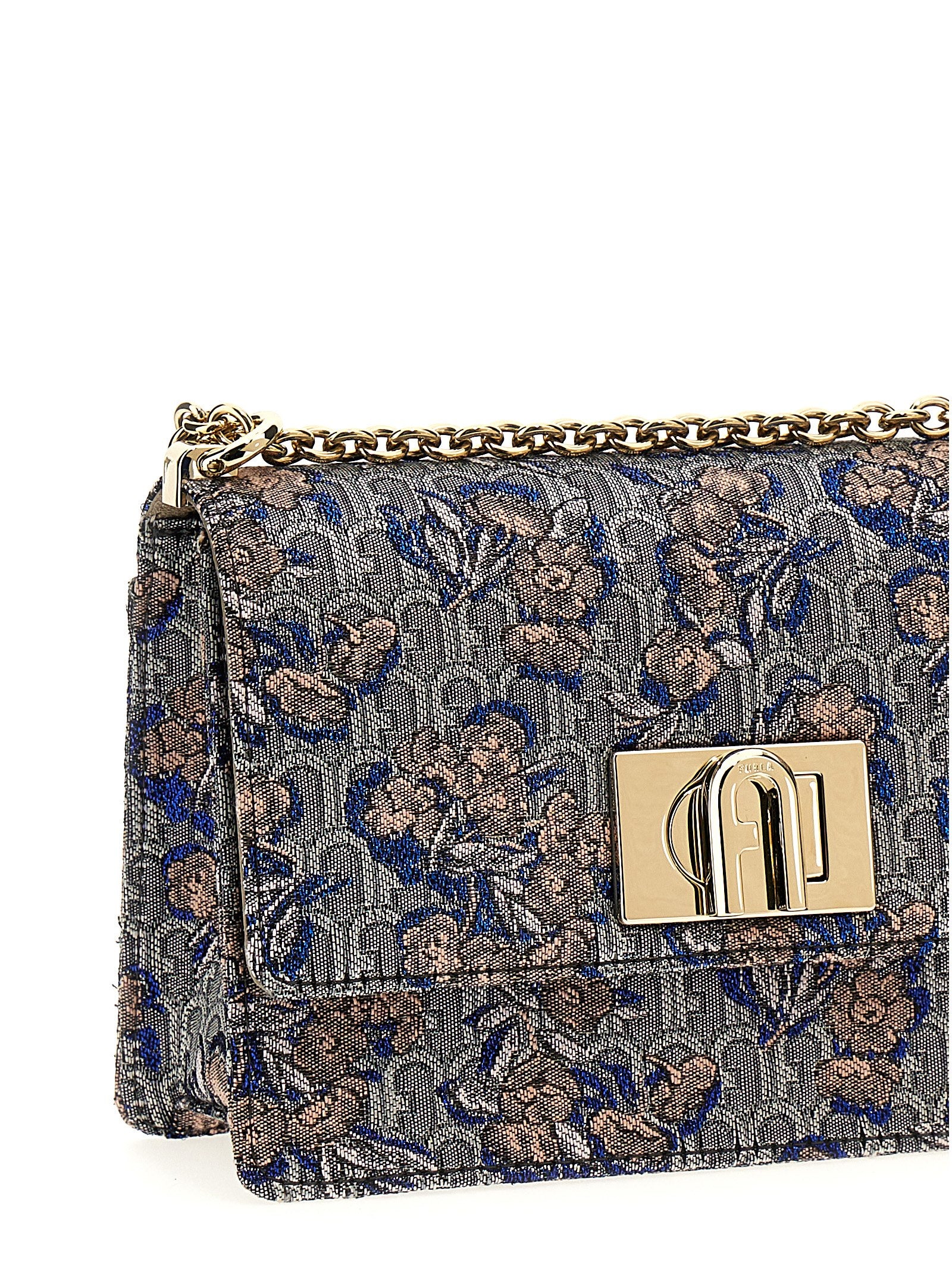 'Furla 1927 mini' crossbody bag in leather and jacquard fabric, front metal closure, leather and chain shoulder strap.
