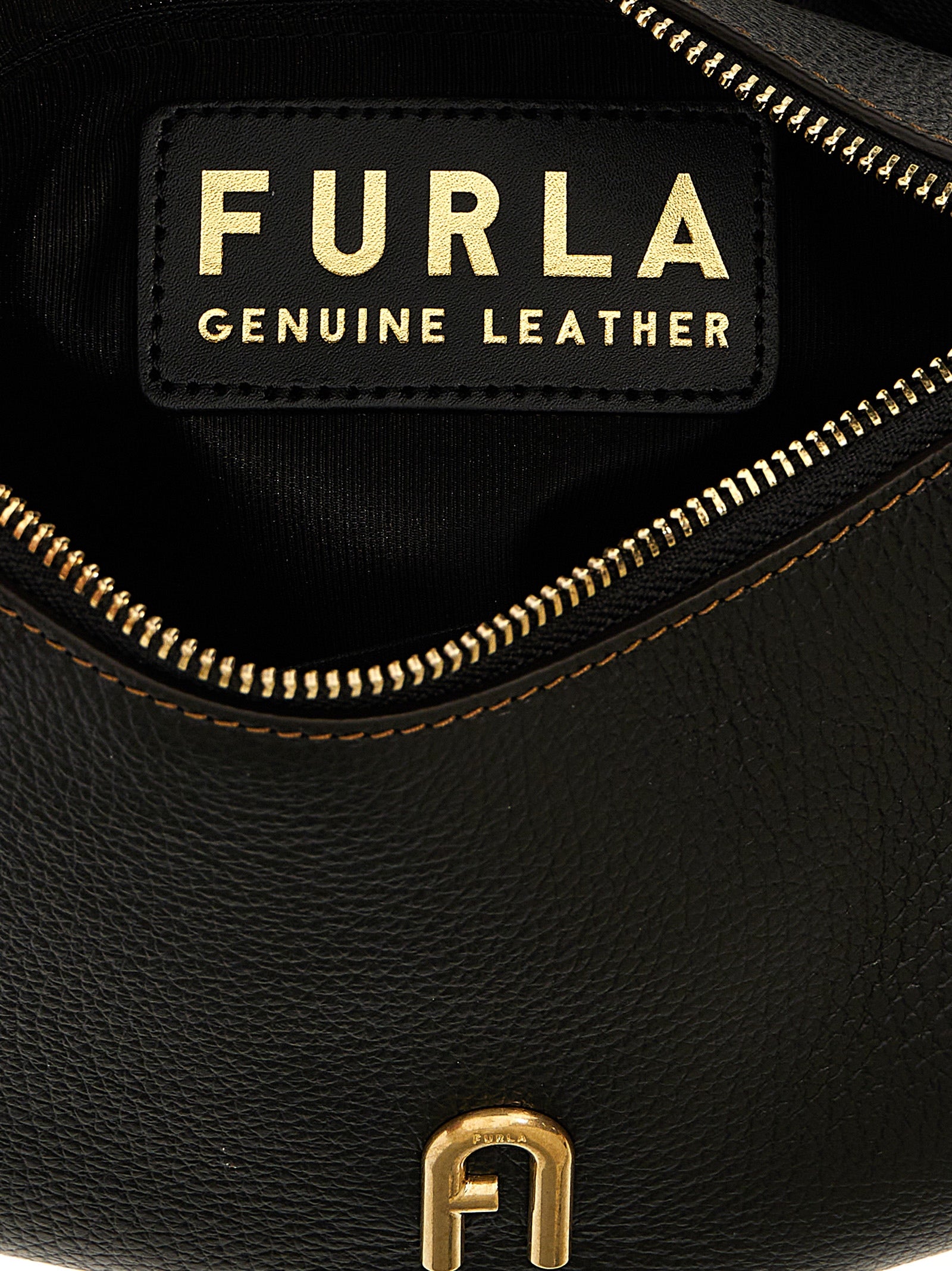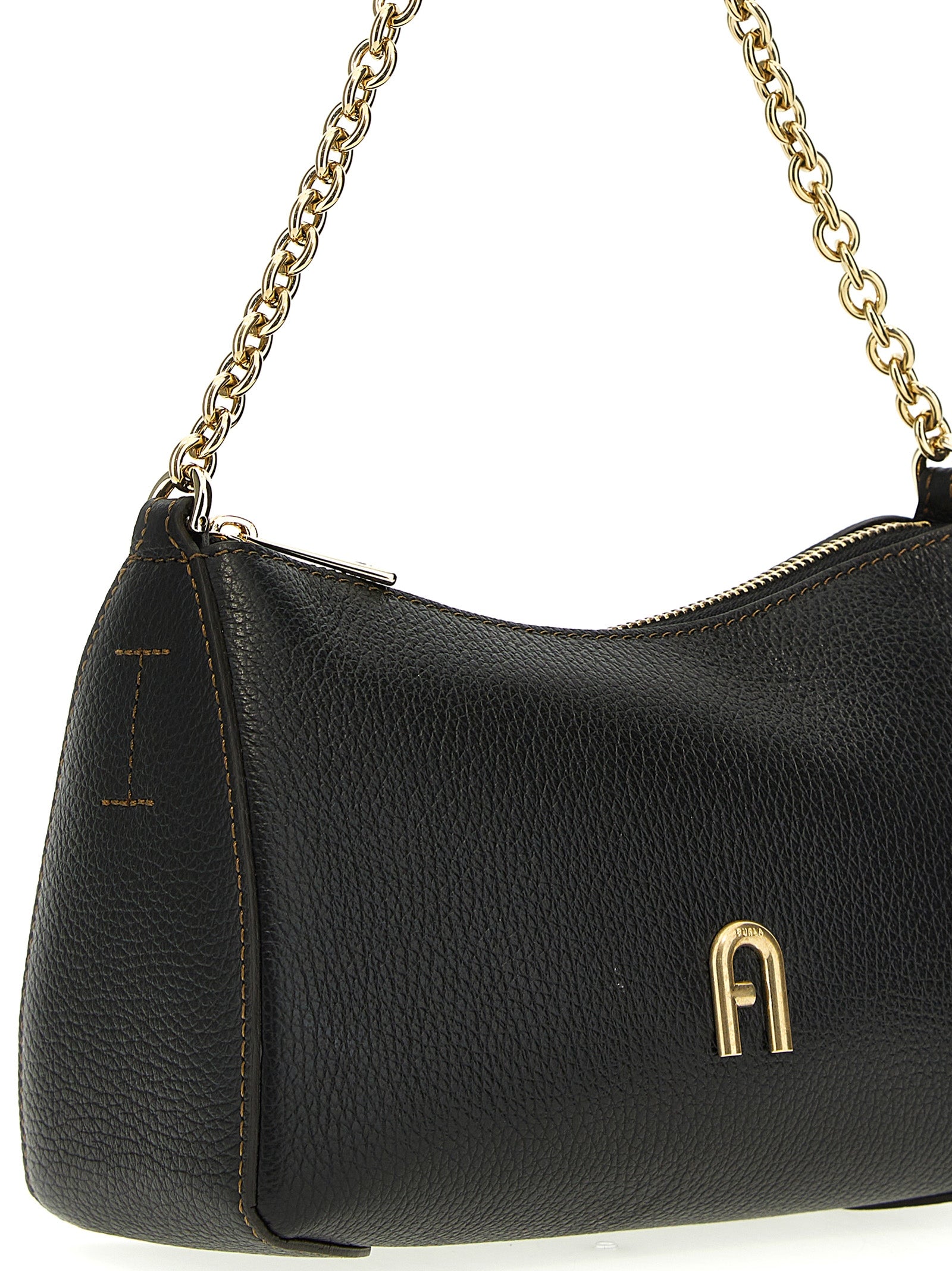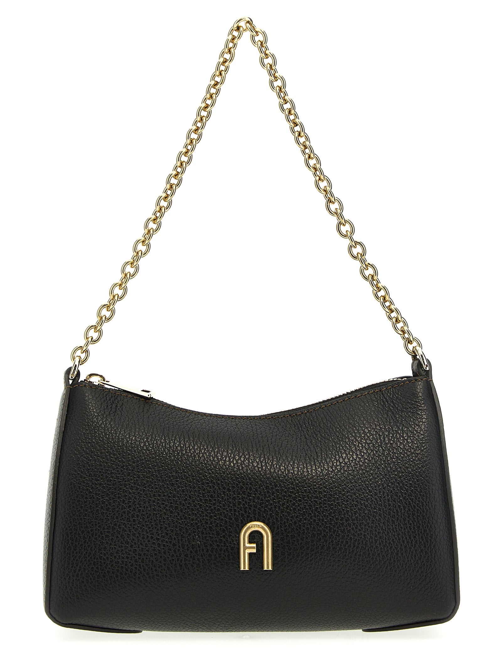 'Primula Mini' leather crossbody bag with front metal logo, zip closure, chain handle, adjustable and removable shoulder strap.