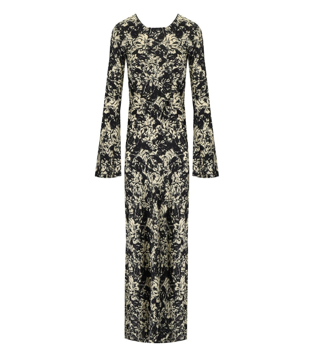 Ganni dress made of black satin-effect fabric with contrasting print. Long flared sleeves, slim fit on the bust. The model is 175 cm tall and wears a size S. Composition: 95% recycled viscose, 5% spandex.