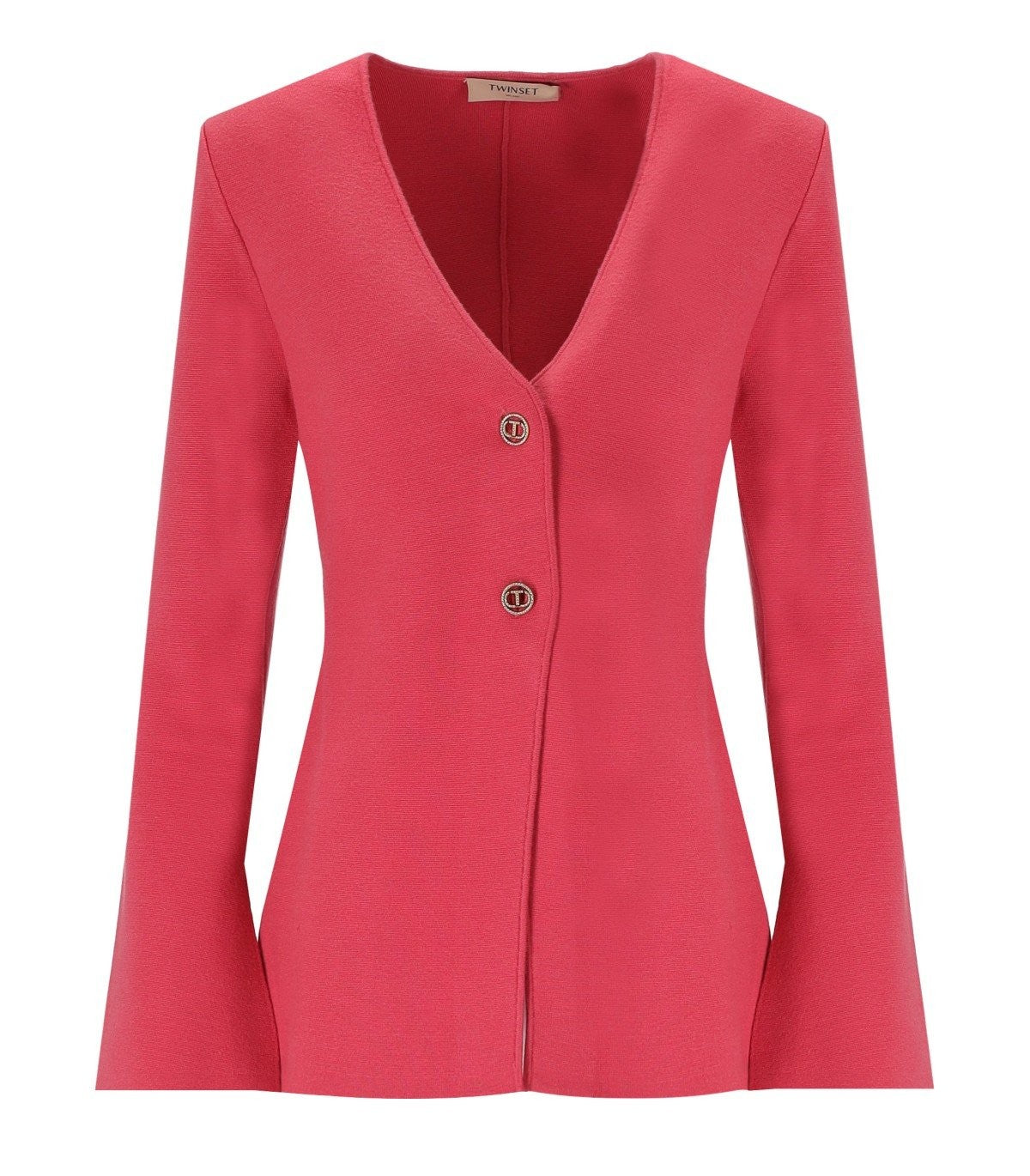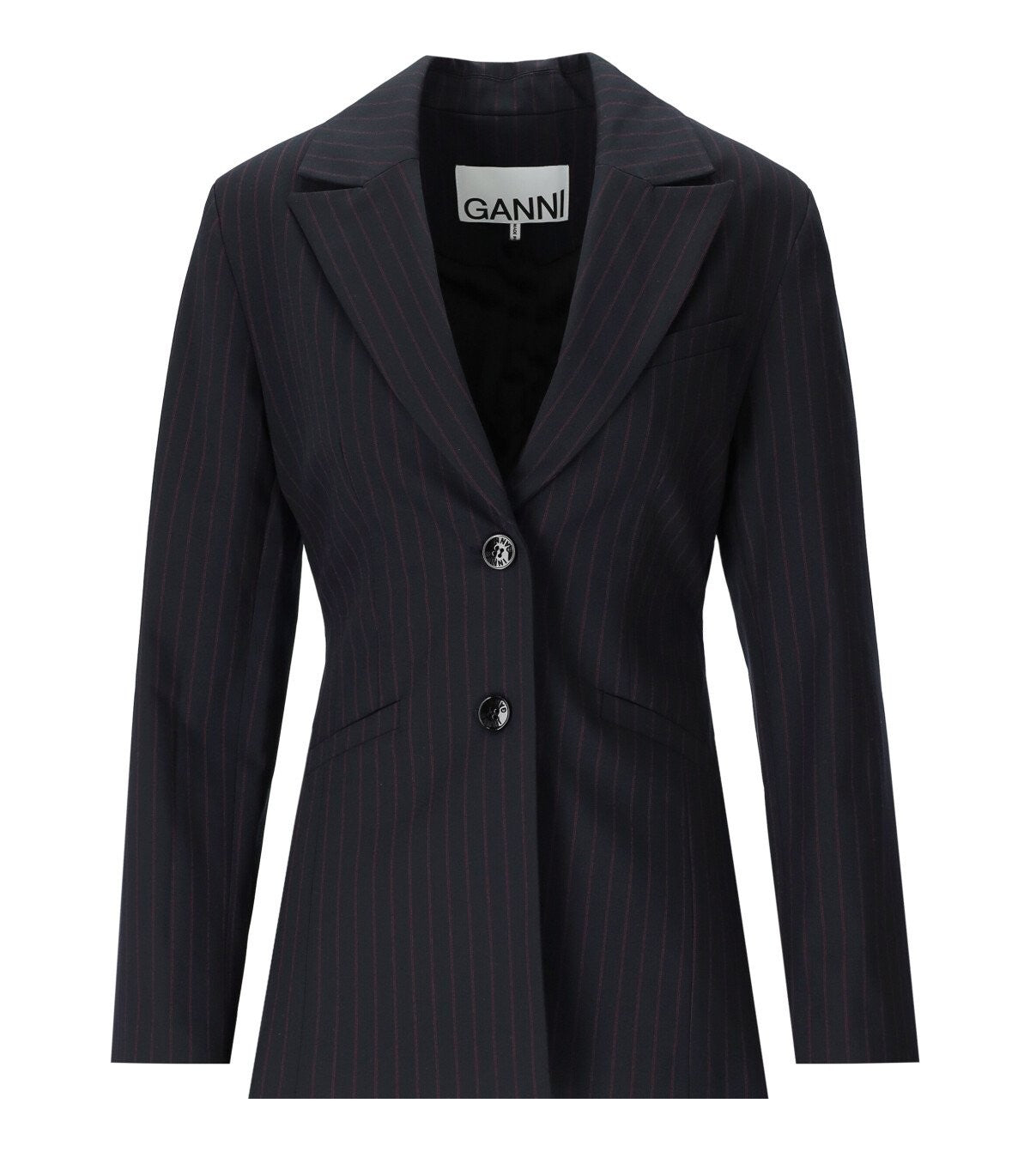 Ganni blazer made of blue viscose blend with contrasting pinstripe motif. Padded shoulders and single-breasted closure with logoed buttons. Polyester lining, slim fit. Composition: 61% recycled polyester, 32% viscose, 6% elastane, 1% polyester. Lining: 100% polyester.