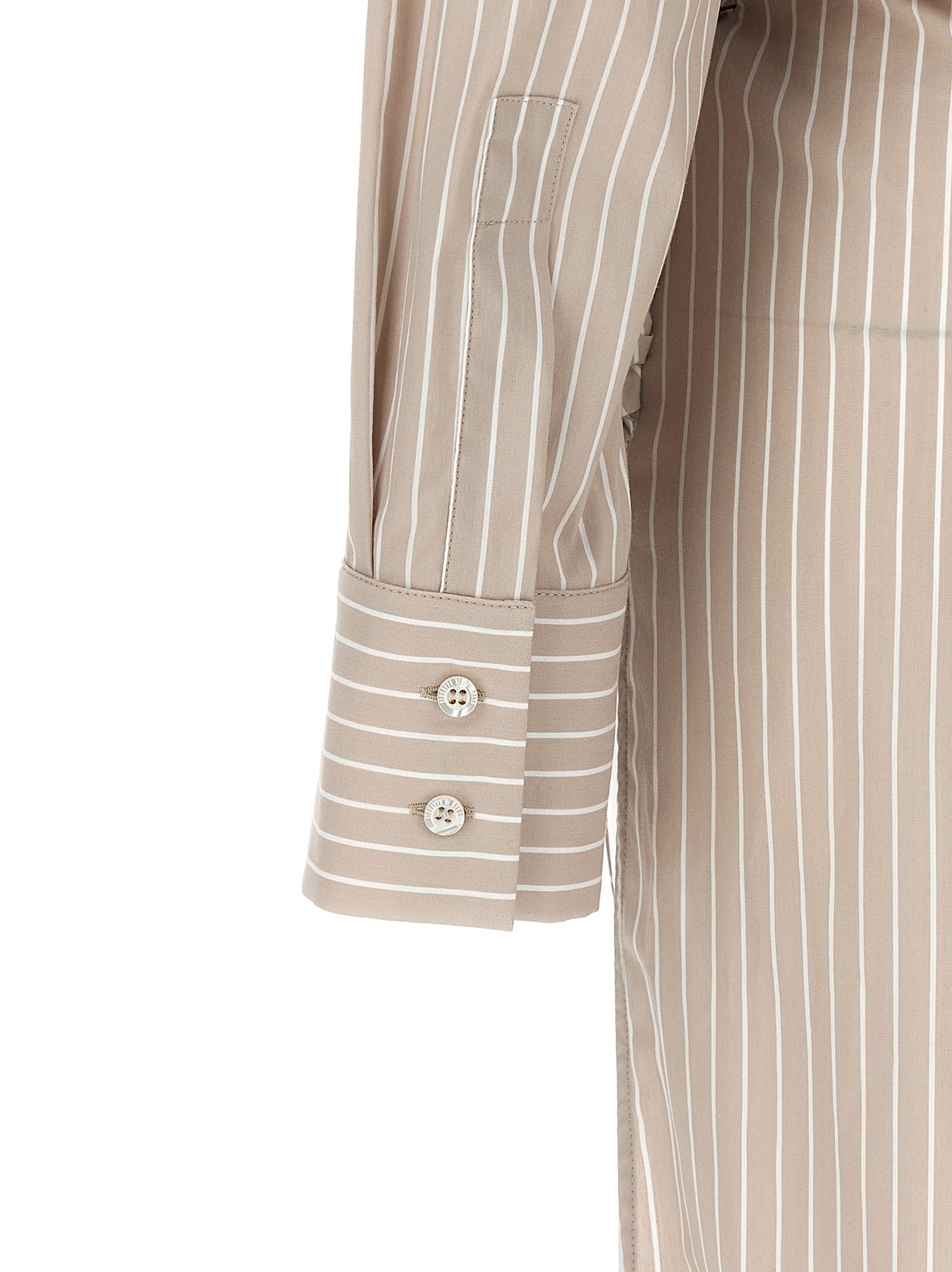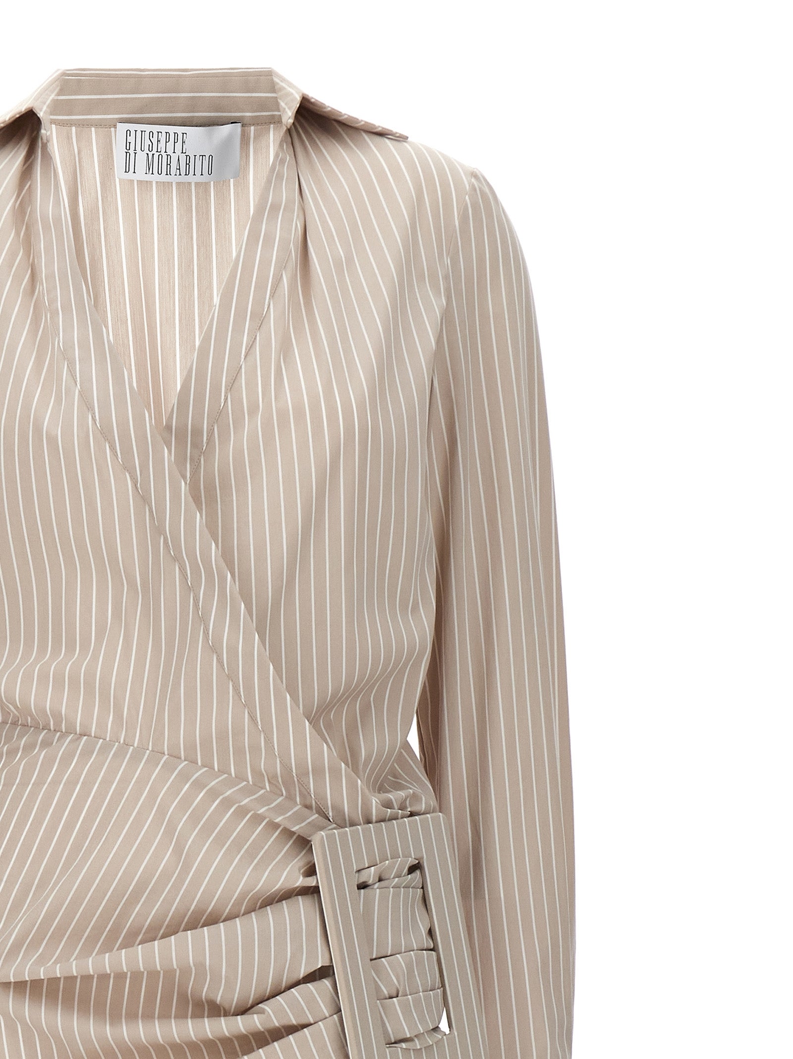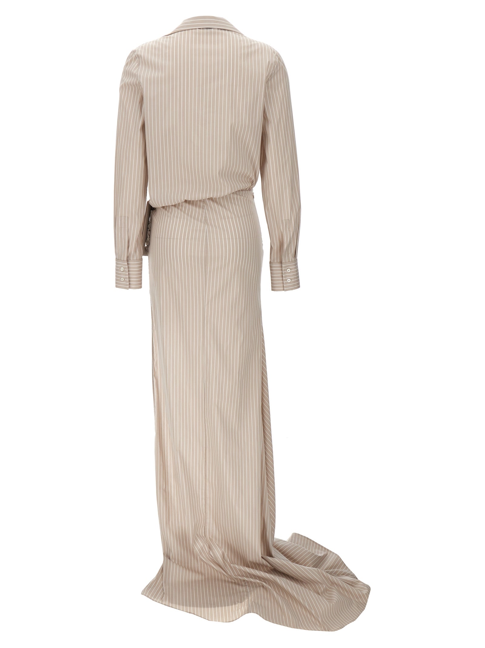 Long striped dress in cotton blend, maxi side buckle detail, side zip closure, split, V-neck, long cuffed sleeves.