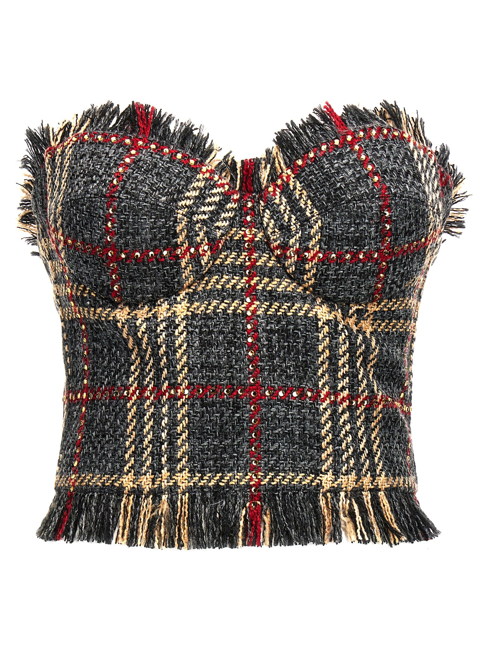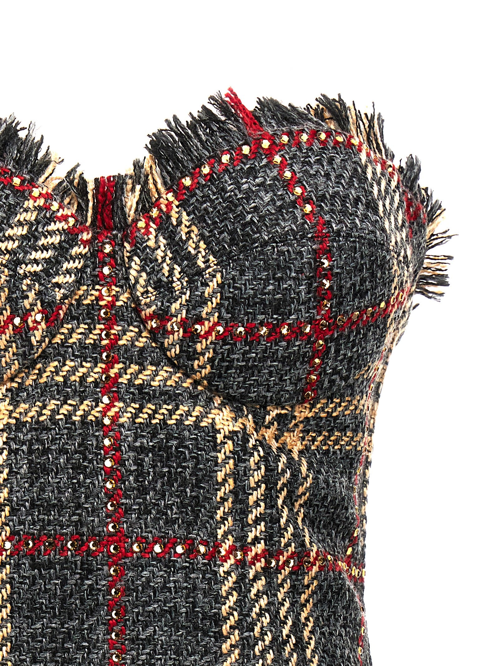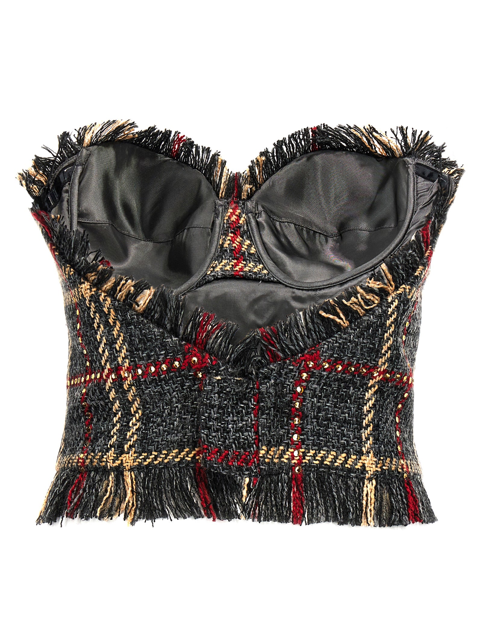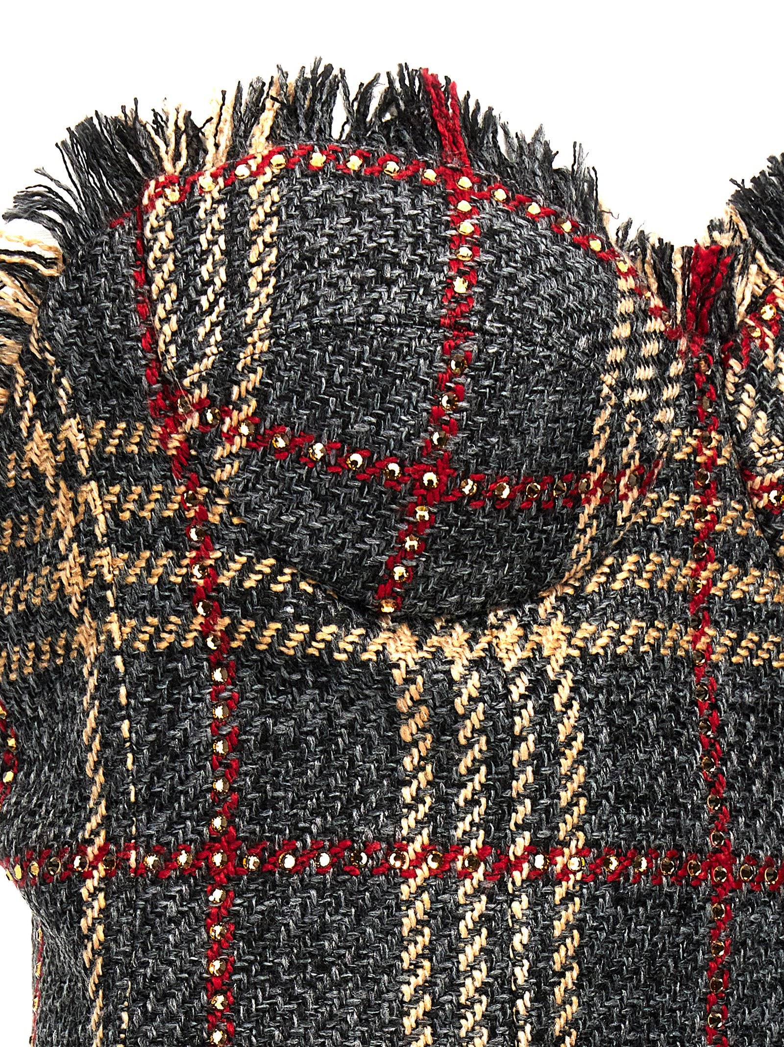 Check wool blend bustier top, rhinestone application, off-the-shoulder cropped style with preformed cups and underwire, hook closure.