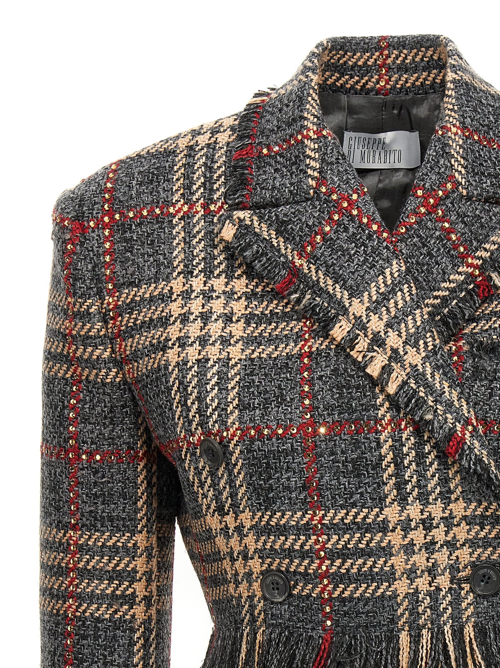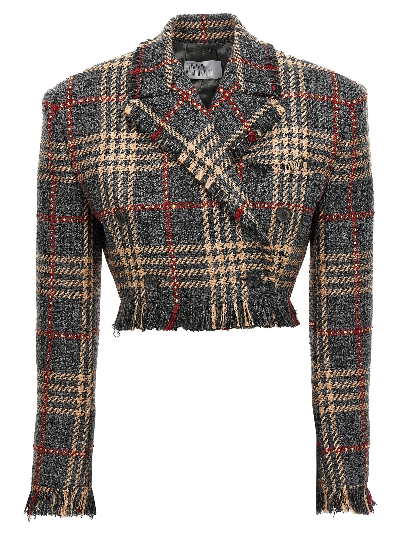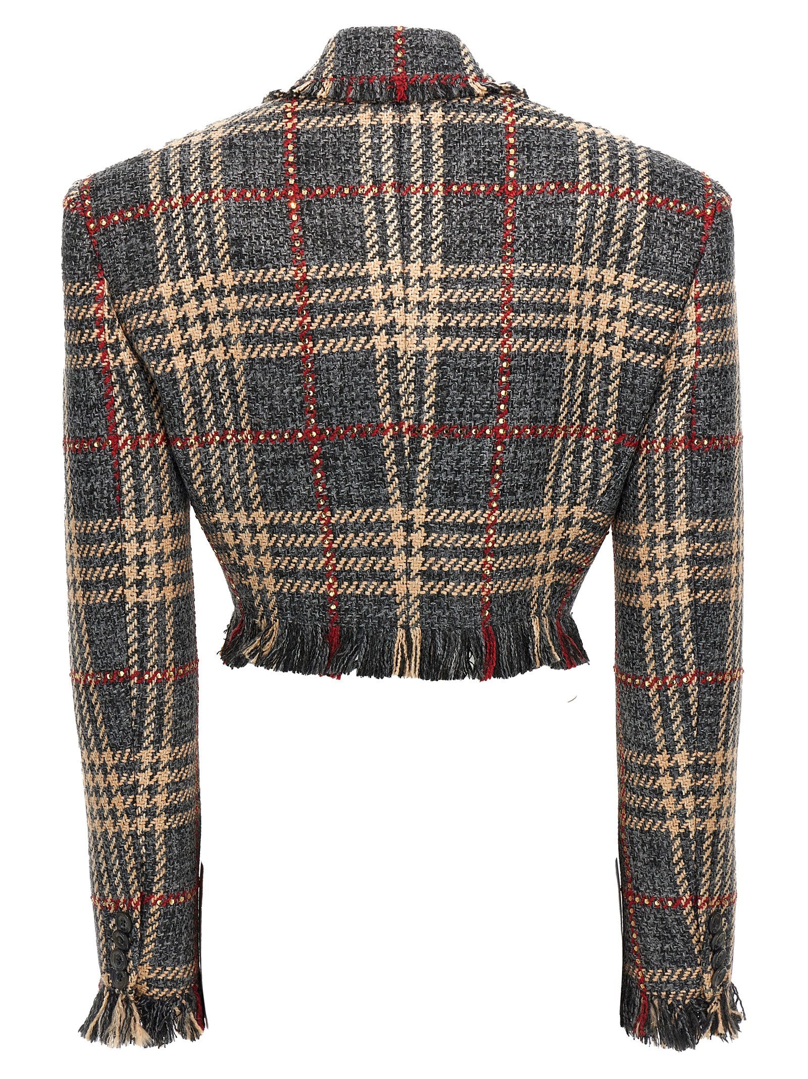 Cropped blazer in check wool blend with rhinestone appliqué, button closure, padded shoulders, long sleeves, fringes on the hem.