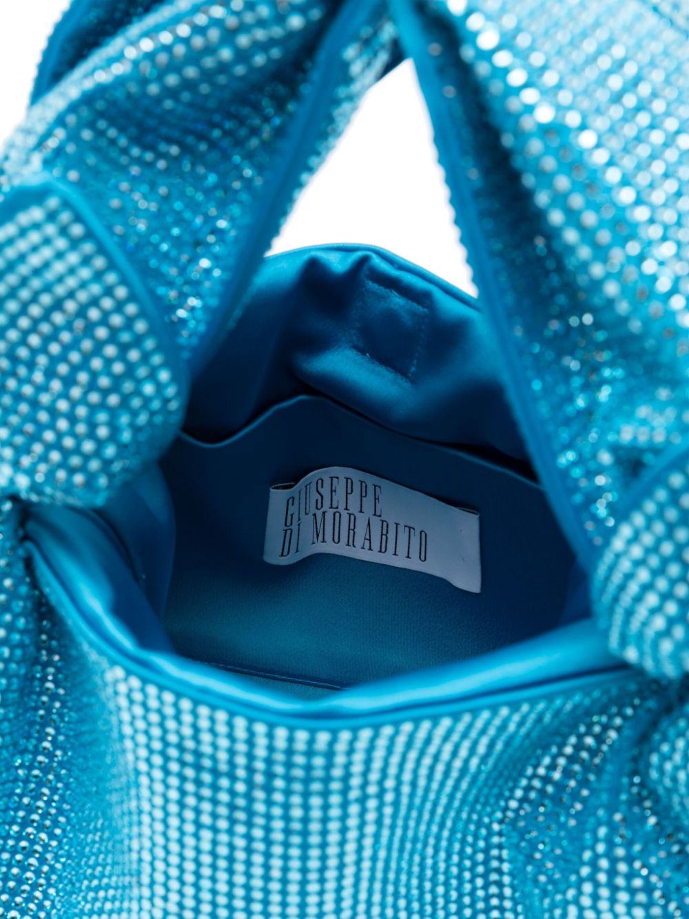 azure rhinestone embellishment knot detailing concealed magnetic fastening two top handles satin lining internal logo patch internal patch pocket main compartment