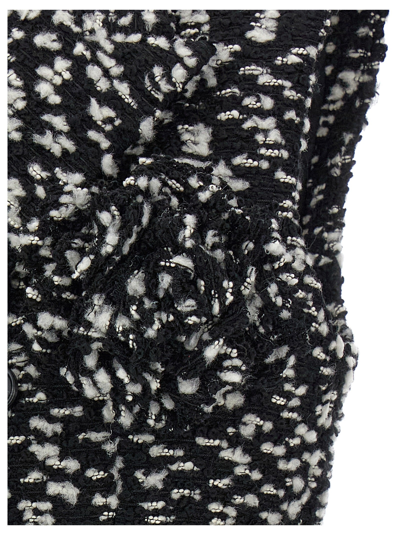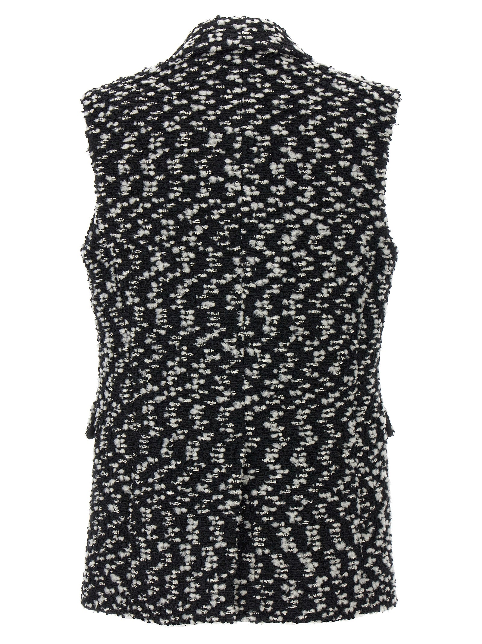 Double-breasted bouclé fabric vest with button closure, pockets, removable floral brooch, structured shoulder straps, back split.