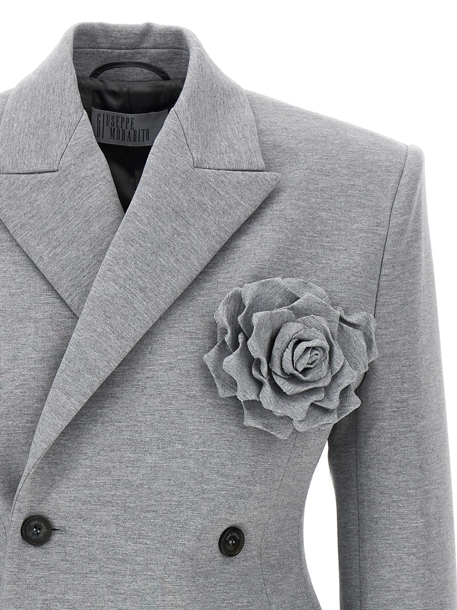 Double-breasted jersey blazer with button closure, removable floral brooch, pockets, padded shoulders, long sleeves.