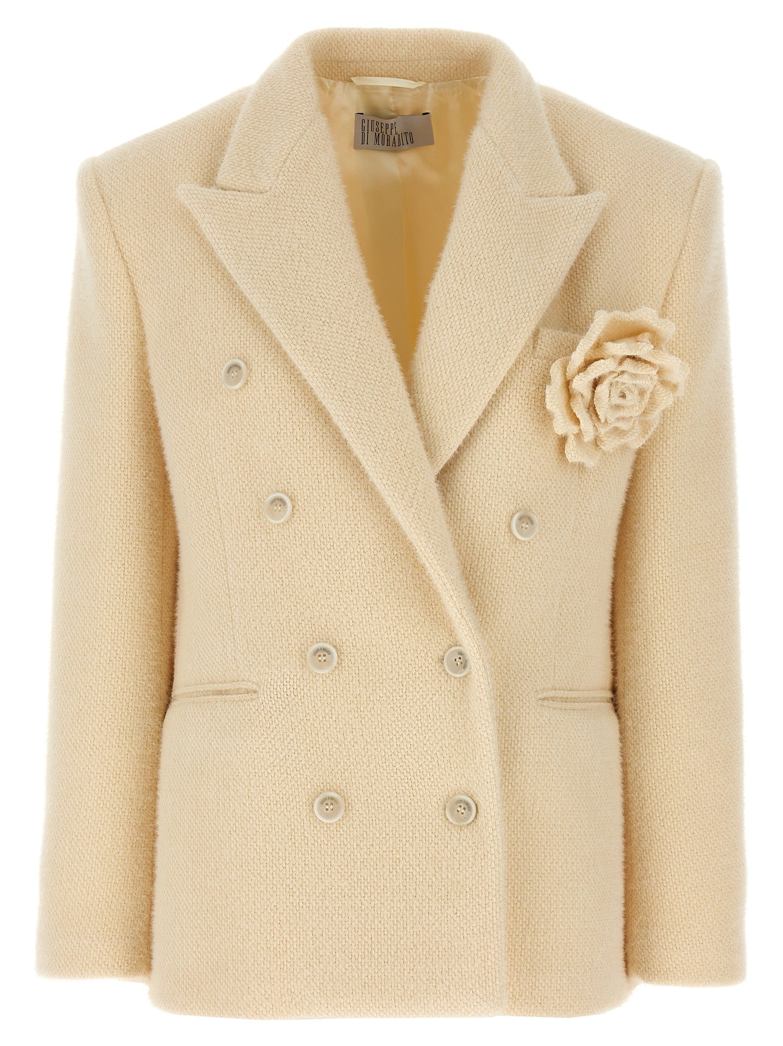 Double-breasted blazer in fabric with button closure, removable floral brooch, pockets, padded shoulders, long sleeves.