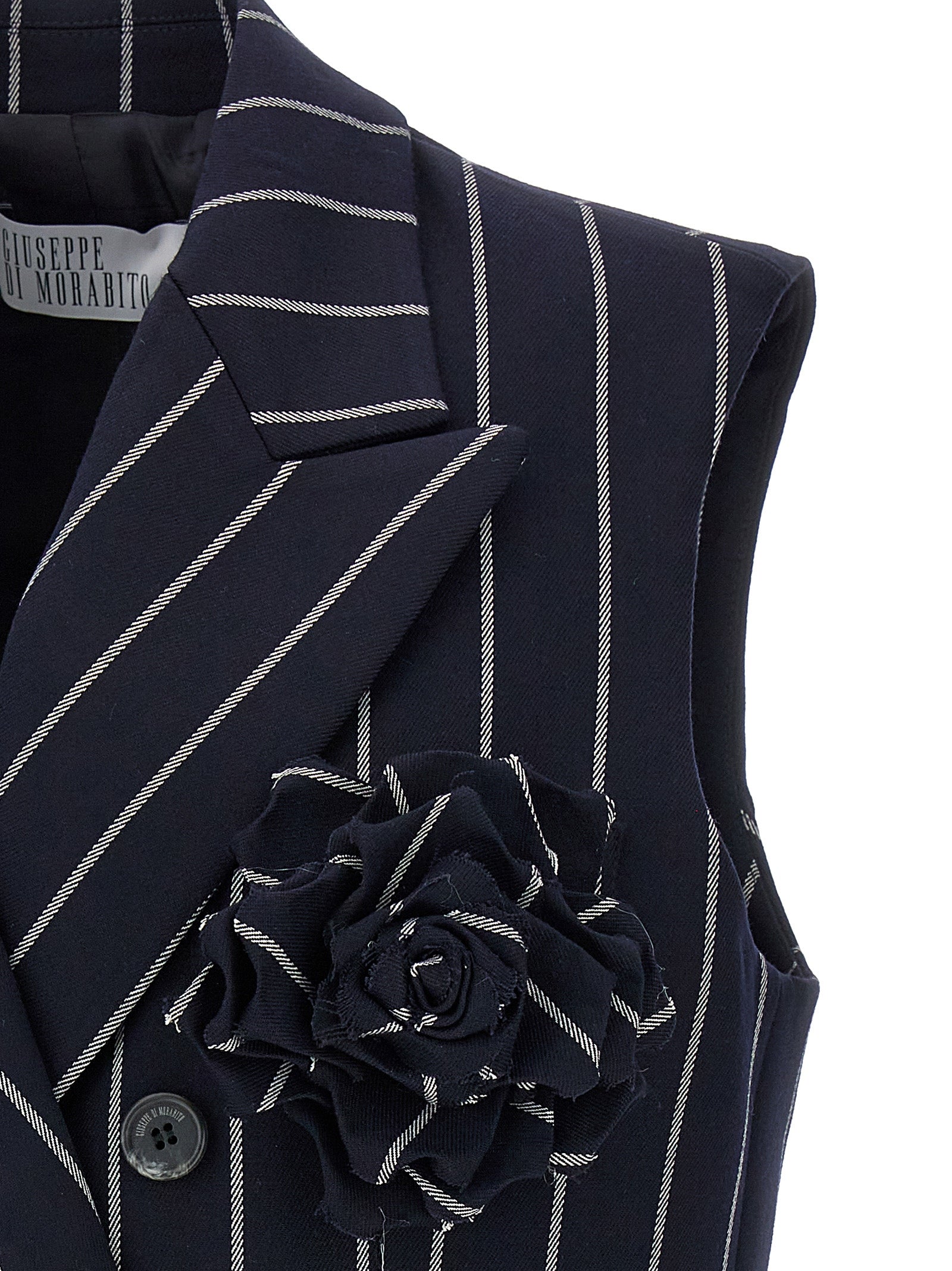 Double-breasted pinstripe vest with button closure, removable floral brooch, pockets, structured shoulder straps, back split.