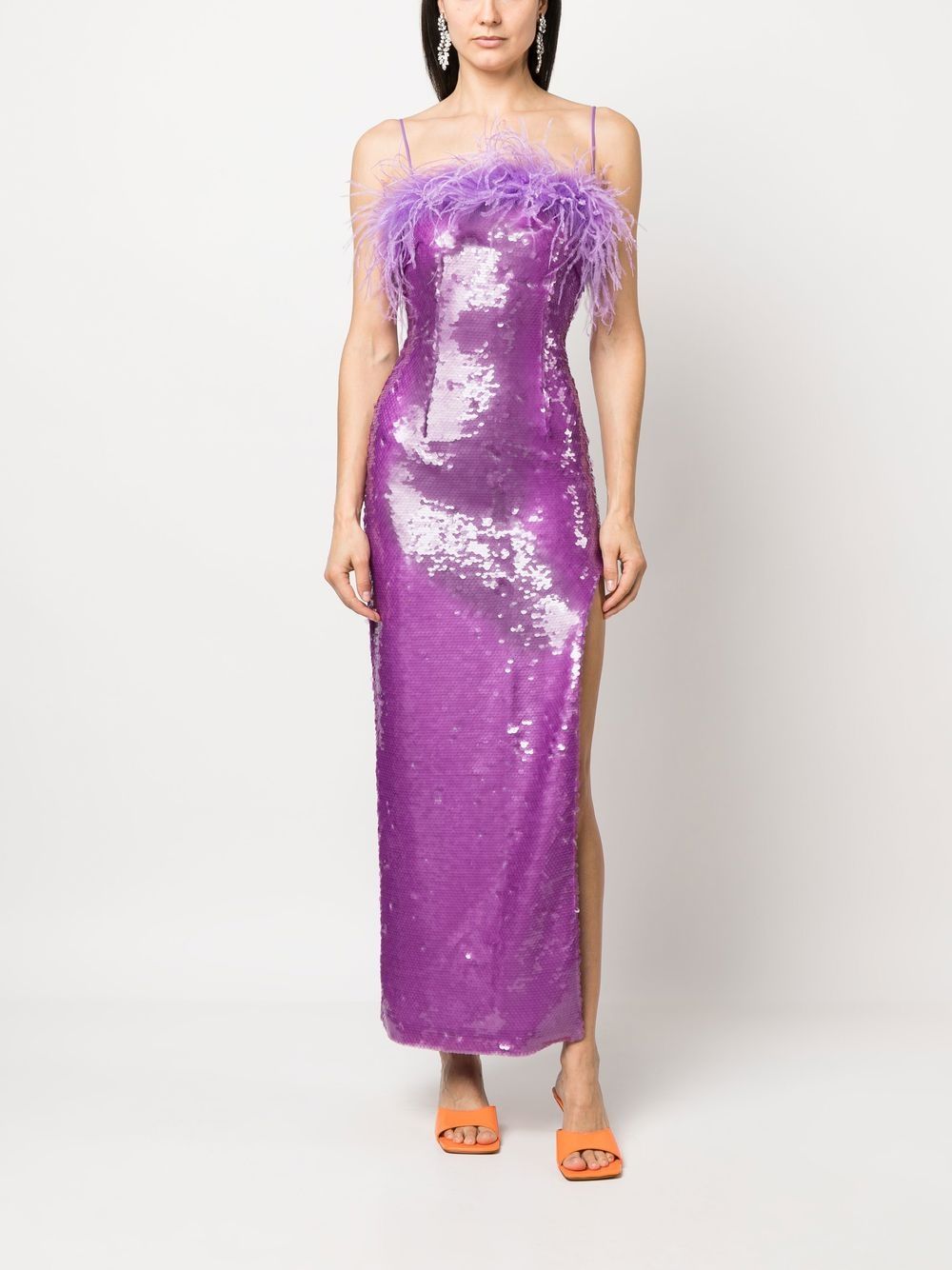feather-detail sequin maxi dress from GIUSEPPE DI MORABITO featuring purple, ostrich feather, sequin design, feather detailing, adjustable spaghetti straps, side slit, sleeveless, straight hem and ankle-length.