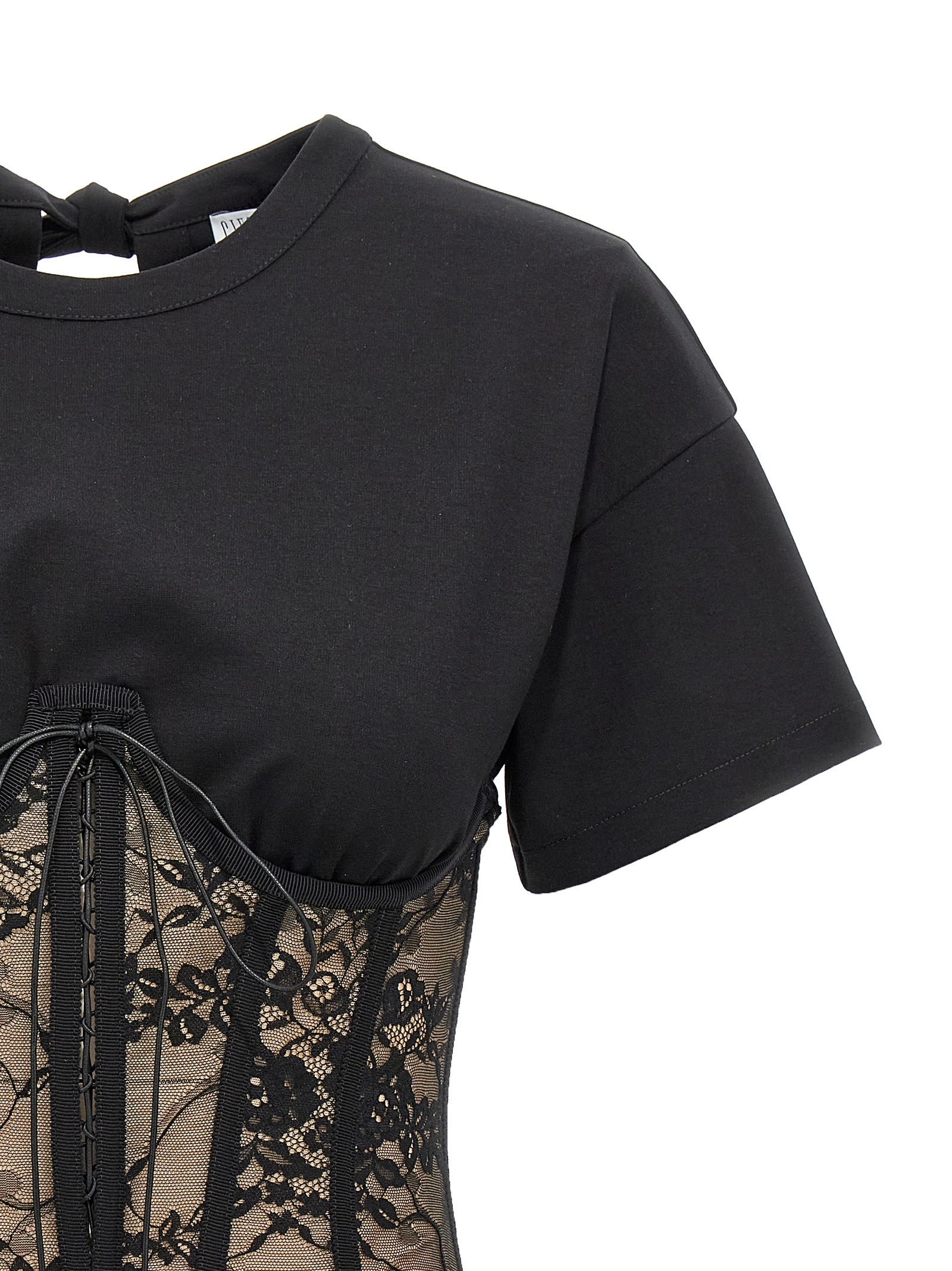 Stretch cotton blend top with lace bodice insert with cues and laces, crew neck, short sleeves, zip closure and back ribbon.