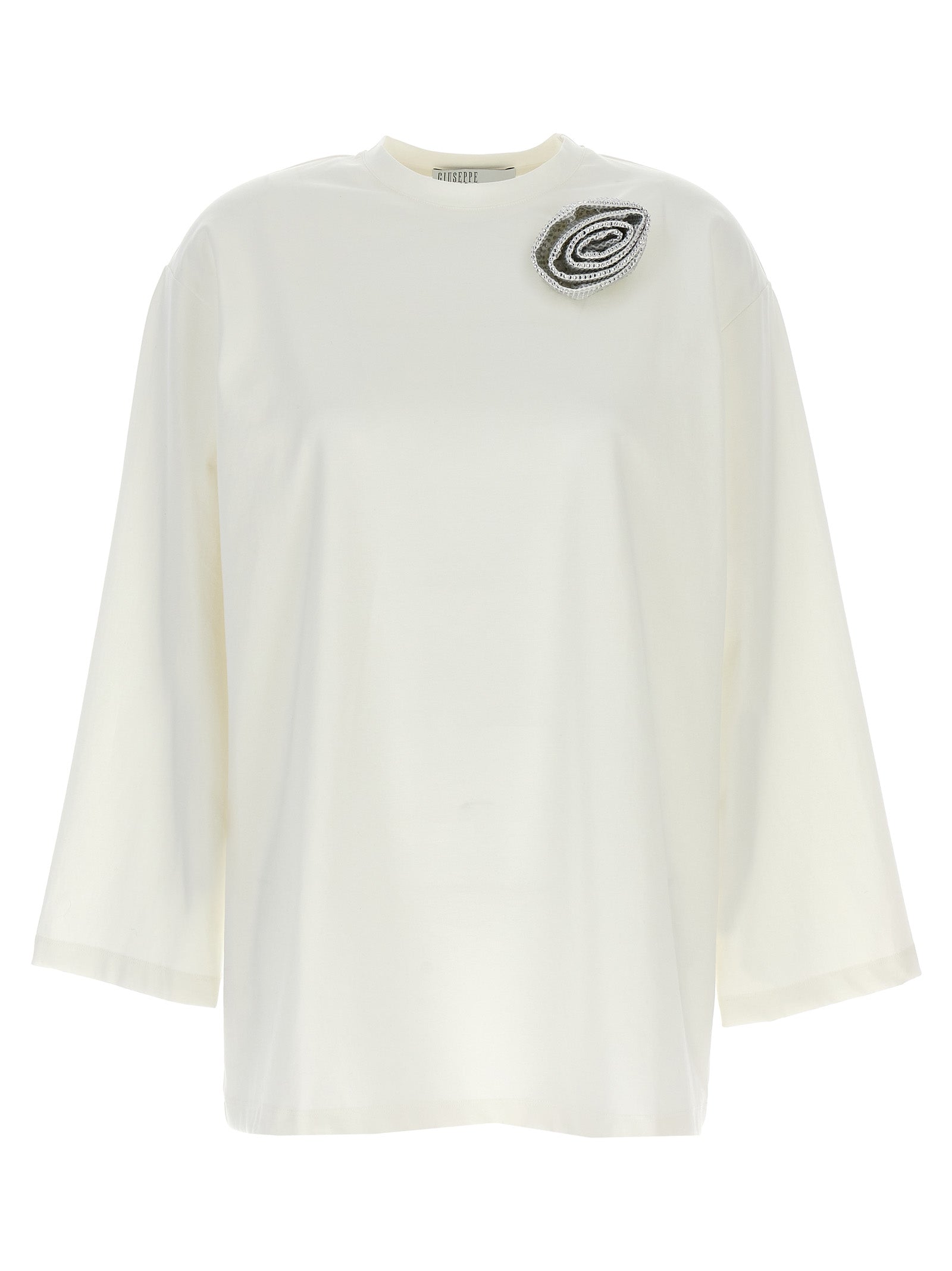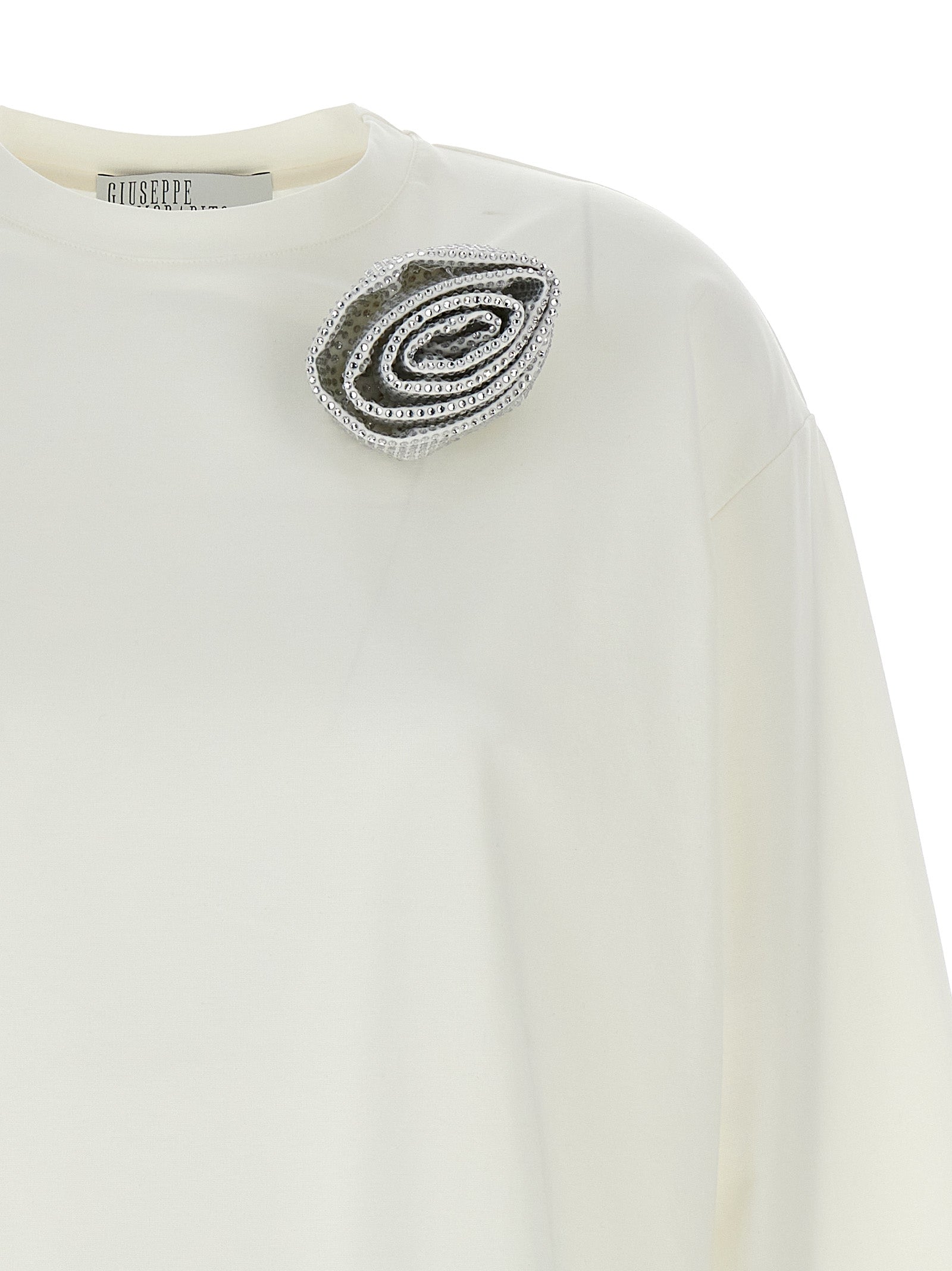 Cotton blend dress with floral brooch with rhinestones on the front, crew neck, long sleeves.
