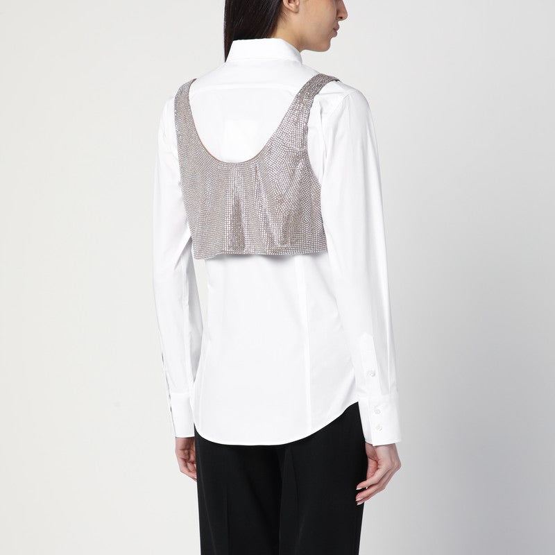 Giuseppe di Morabito white cotton shirt, featuring an insert with an all-over silver rhinestone top, long sleeves with buttoned cuffs, classic collar, front button closure, and slim fit.