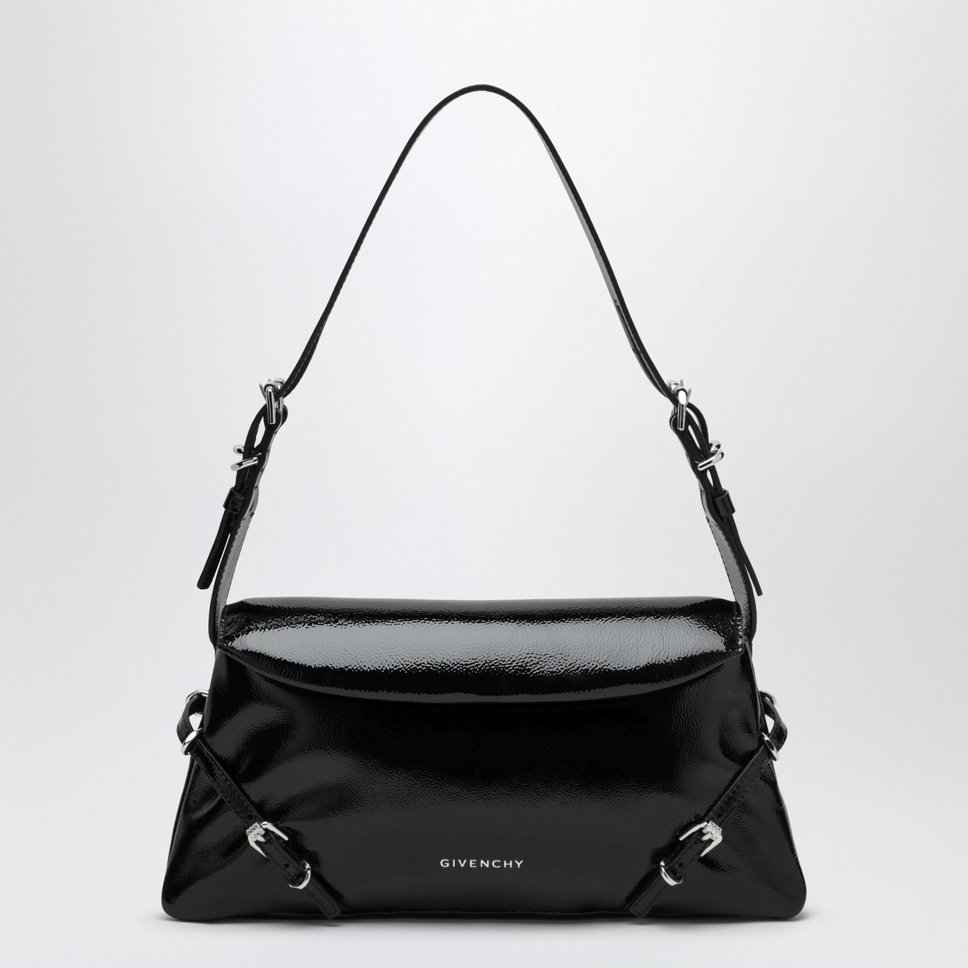 Givenchy shoulder bag in glossy black patent leather, featuring an adjustable and removable handle with side buckles, a front flap with magnetic closure, silver metal buckles and rings, front logo lettering, two compartments with a central separation and a card slot inside.