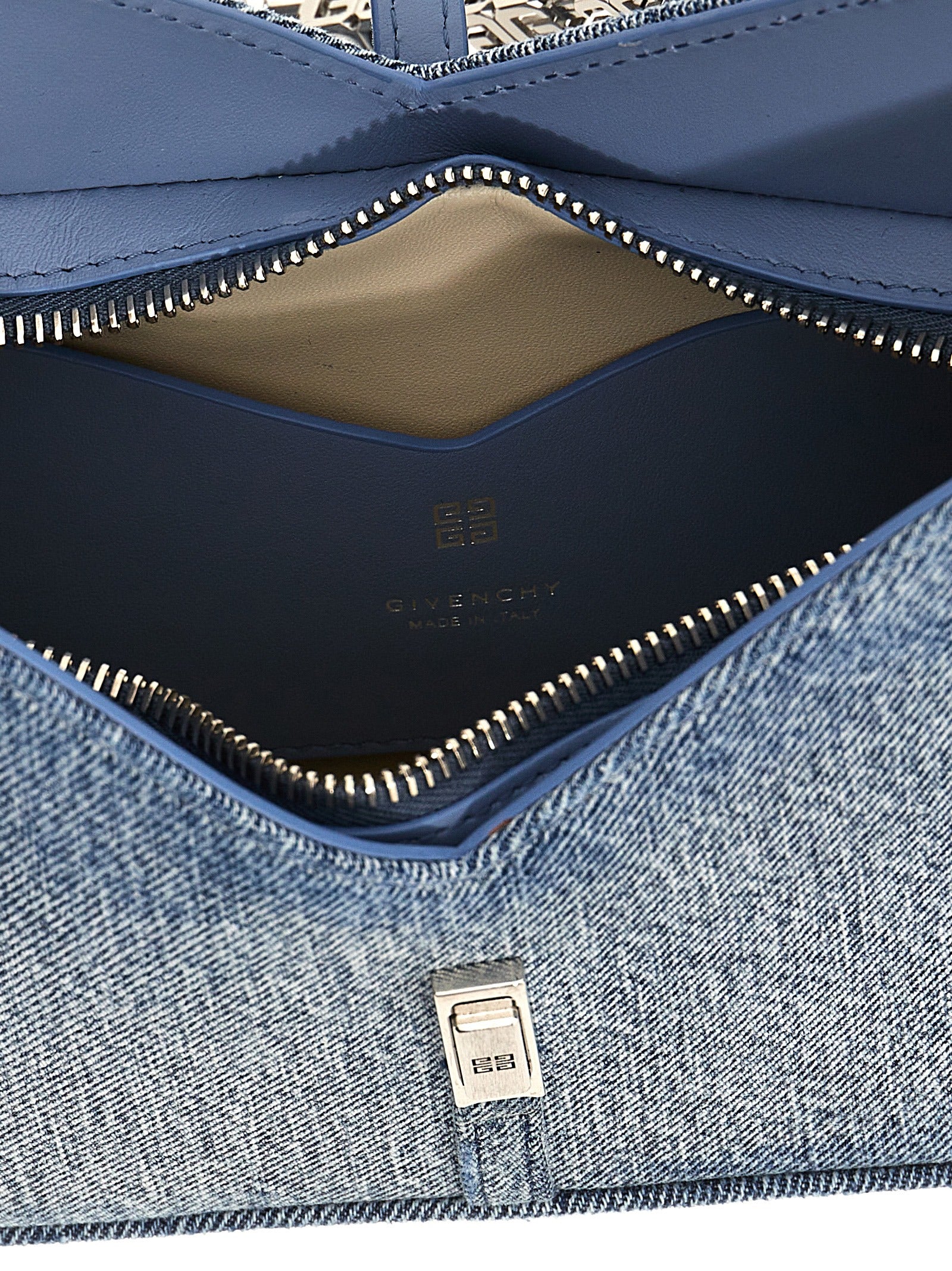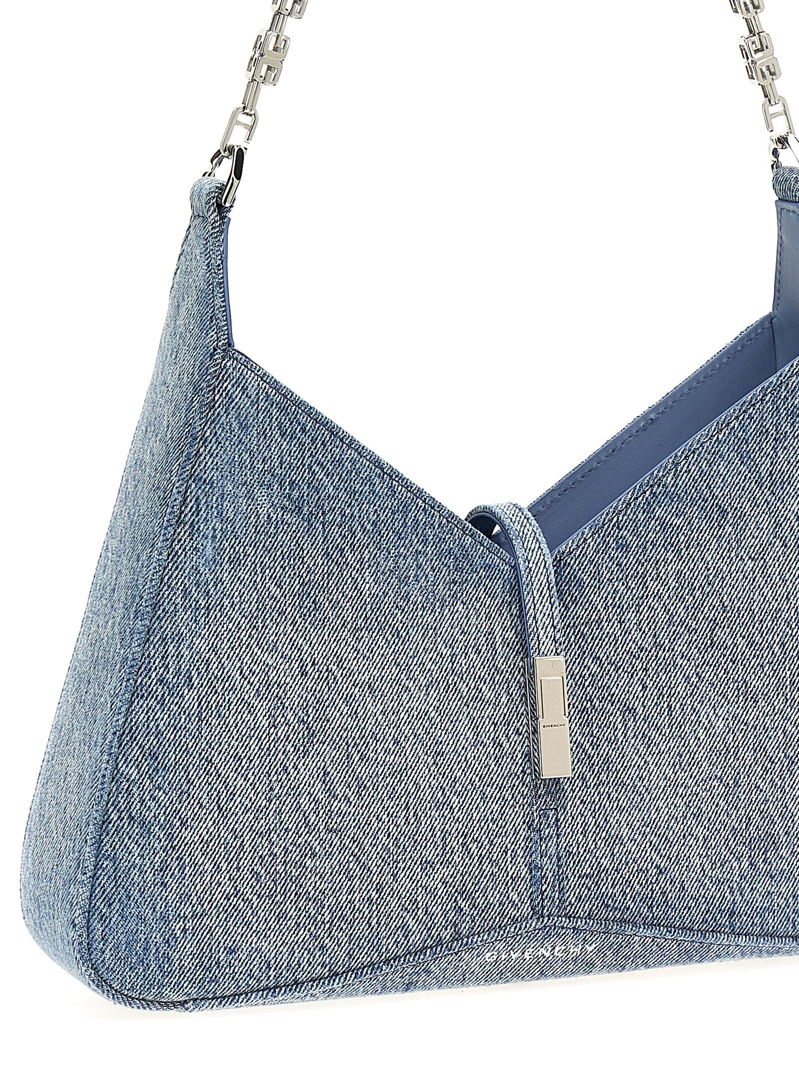 Small 'Cut Out denim shoulder bag, zip closure, magnetic metal logo buckle, thin adjustable shoulder strap, logo chain.