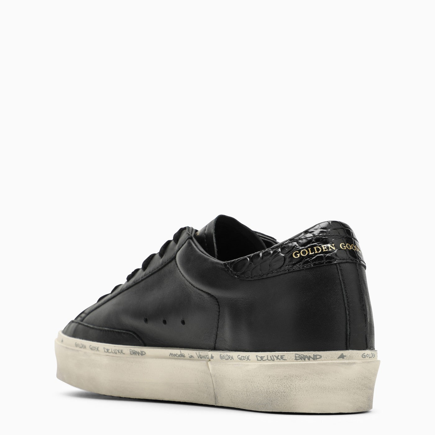 Black leather Golden Goose Deluxe Brand low top trainer featuring a rubber platform sole, a round toe, a lace-up fastening, an iconic suede star stitched on one side, a croc-print leather heel with logo and a vintage-effect finish.