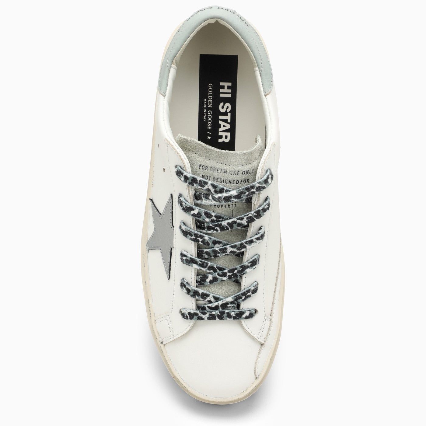 Low top sneakers by Golden Goose Deluxe Brand in white leather featuring a rubber platform sole, a round toe, a lace-up fastening with a spotted print, an iconic star and stitched on one side, a grey leather heel with a logo and a vintage effect workmanship.