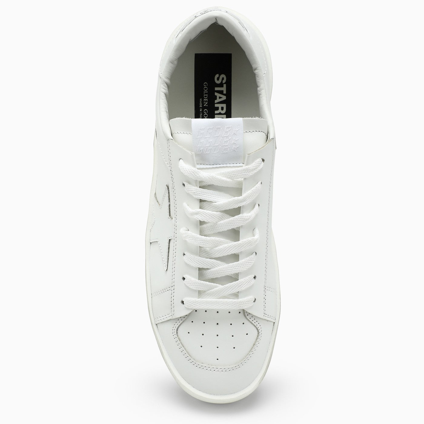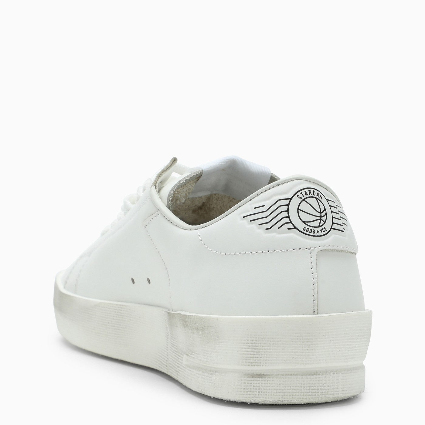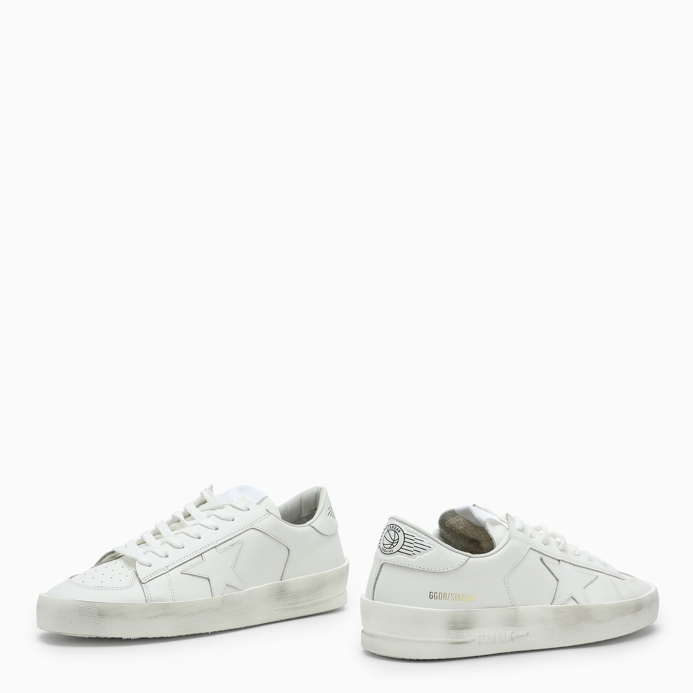 Low-top sneakers by Golden Goose Deluxe Brand in white leather, featuring lace closure, side logo patch, side logo print, contrasting print on the heel and rubber sole.