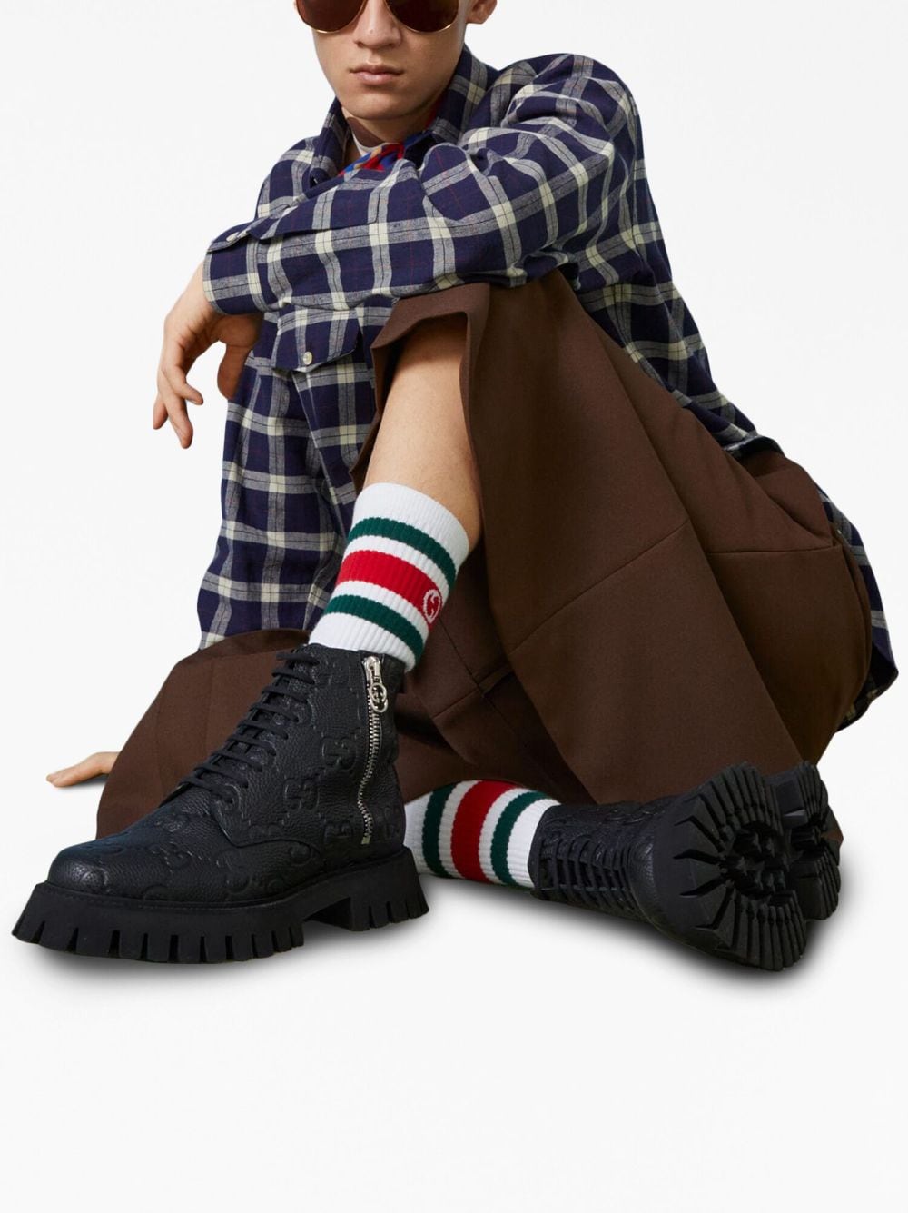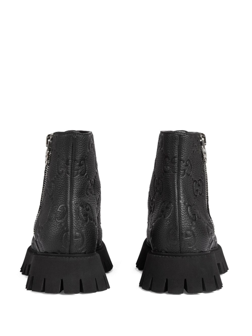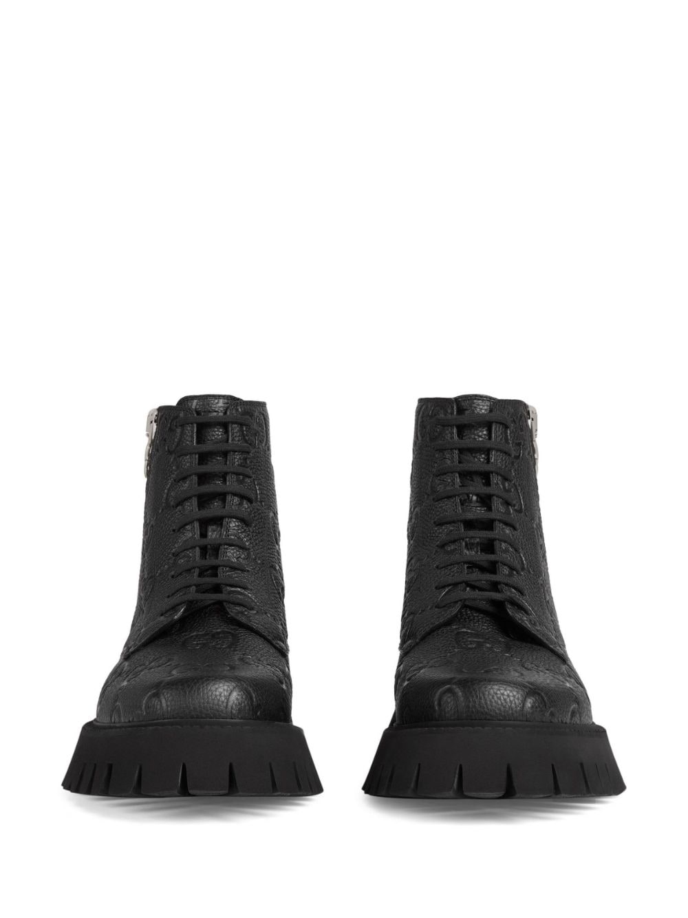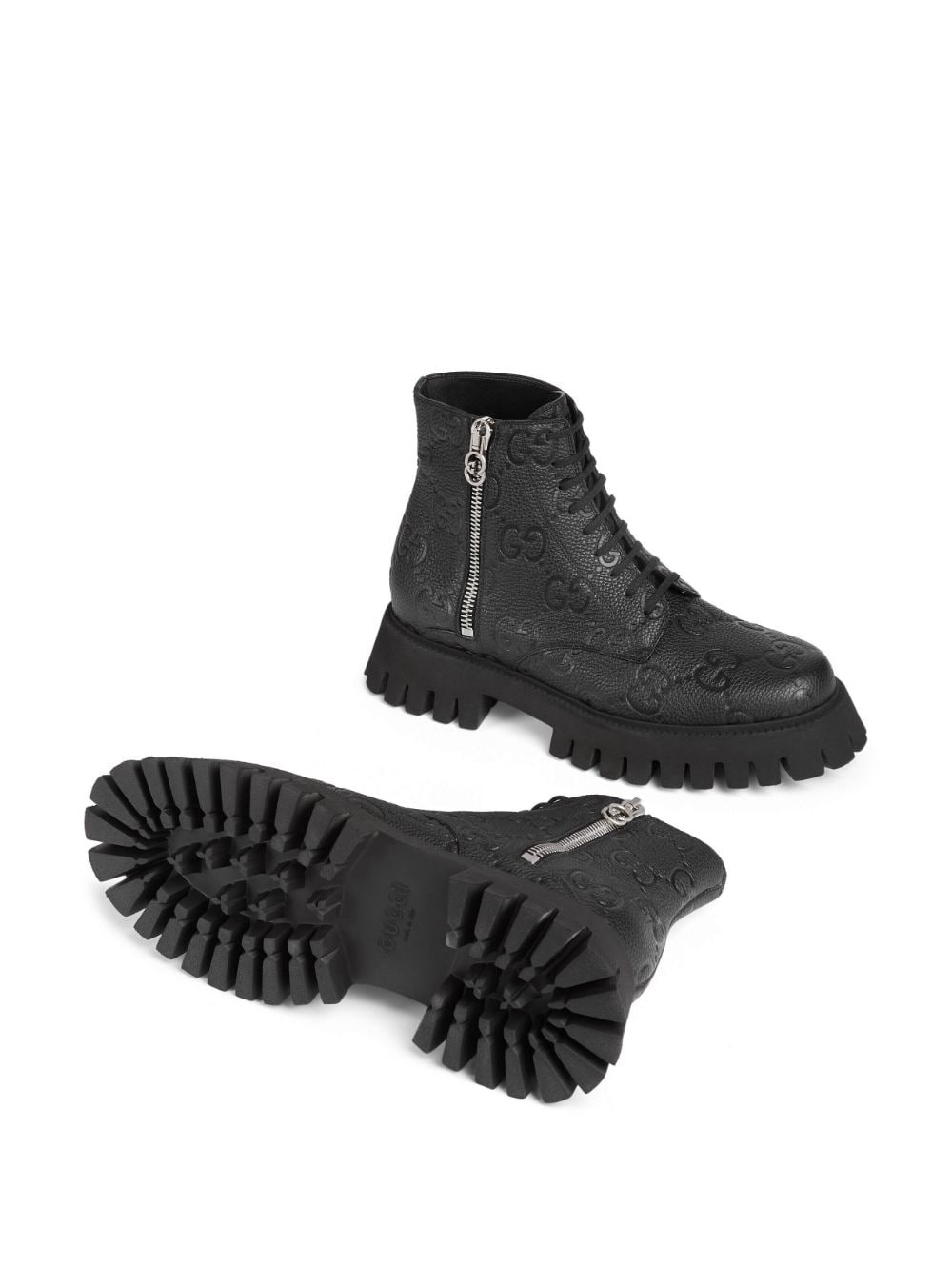 GG leather boots from Gucci featuring black, leather, GG Supreme canvas, round toe, side zip fastening, front lace-up fastening and ridged rubber sole.