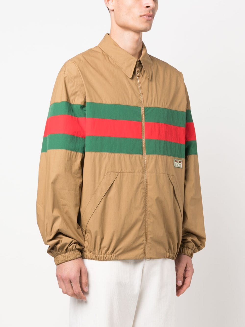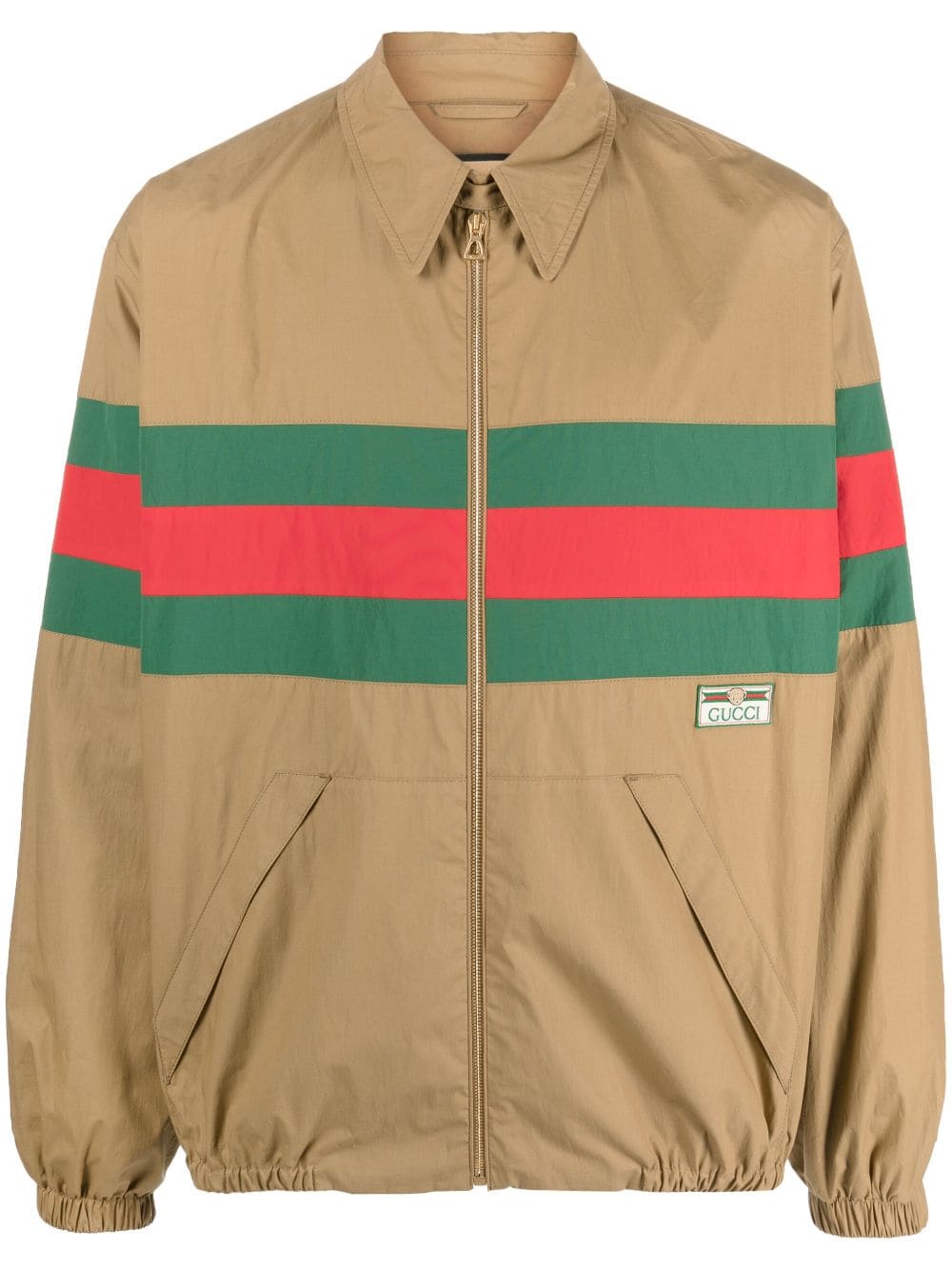 Web-stripe zip-up shirt jacket from Gucci featuring barley brown, cotton, signature Web detailing, logo patch to the front, classic collar, front zip fastening, long sleeves, elasticated cuffs, two front welt pockets and elasticated hem.