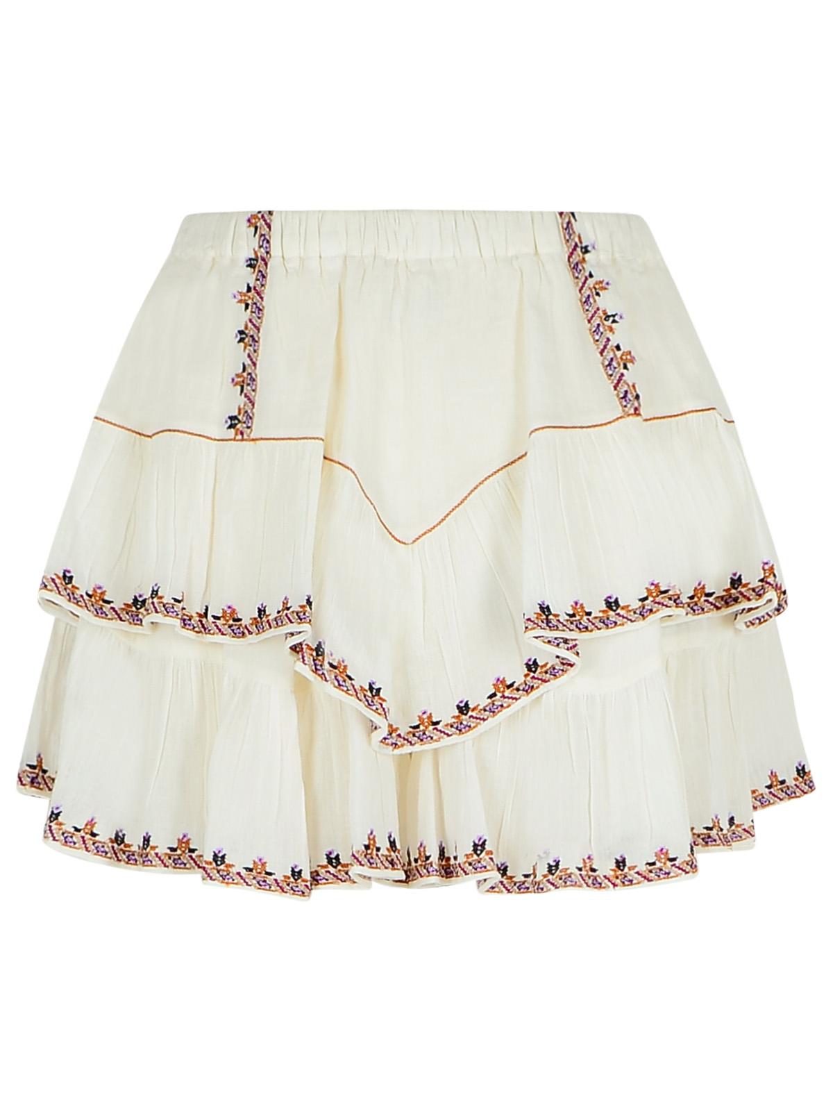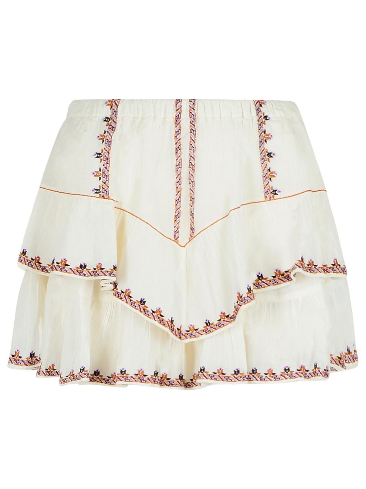 Elastic waistband, tone-on-tone draping, contrast jacquard embroidery