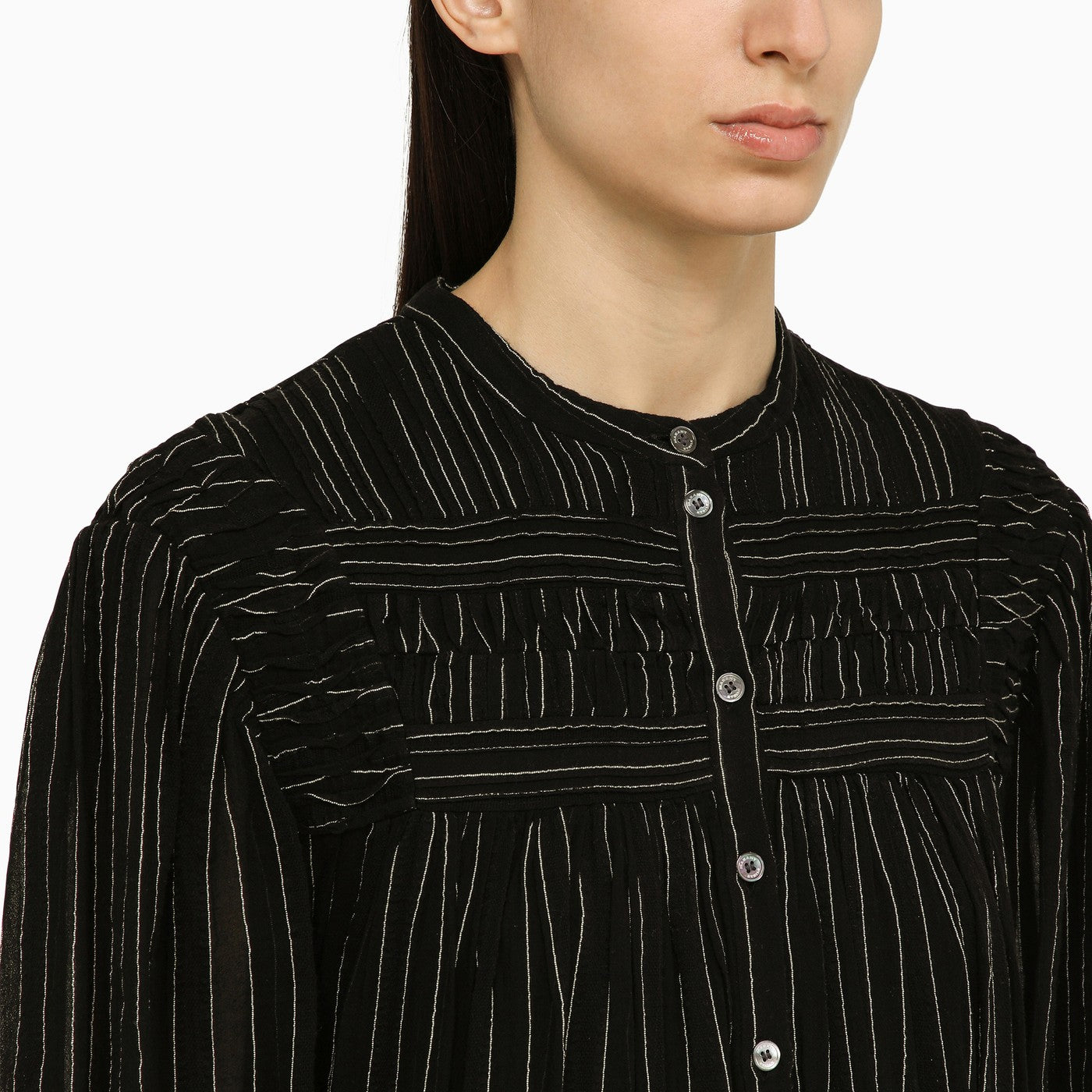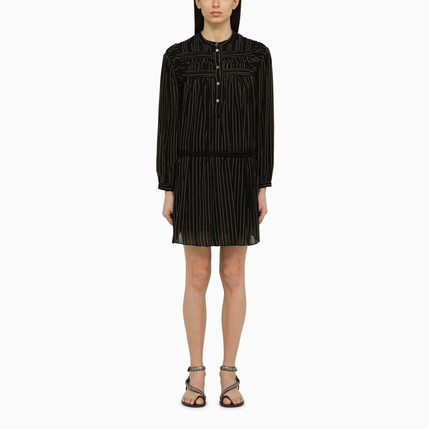 Black striped cotton chemise dress from Isabel Marant Étoile featuring a pleated front design, a front button fastening, long sleeves with button cuffs and a belted waist.