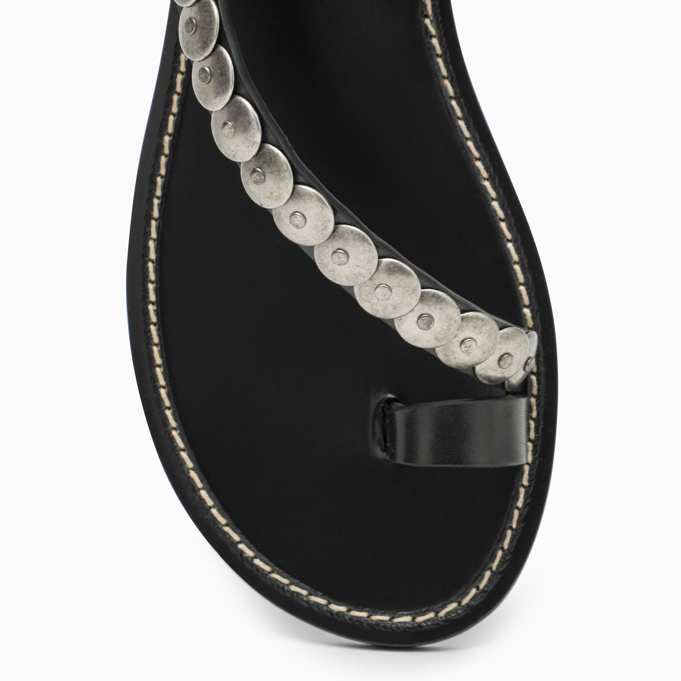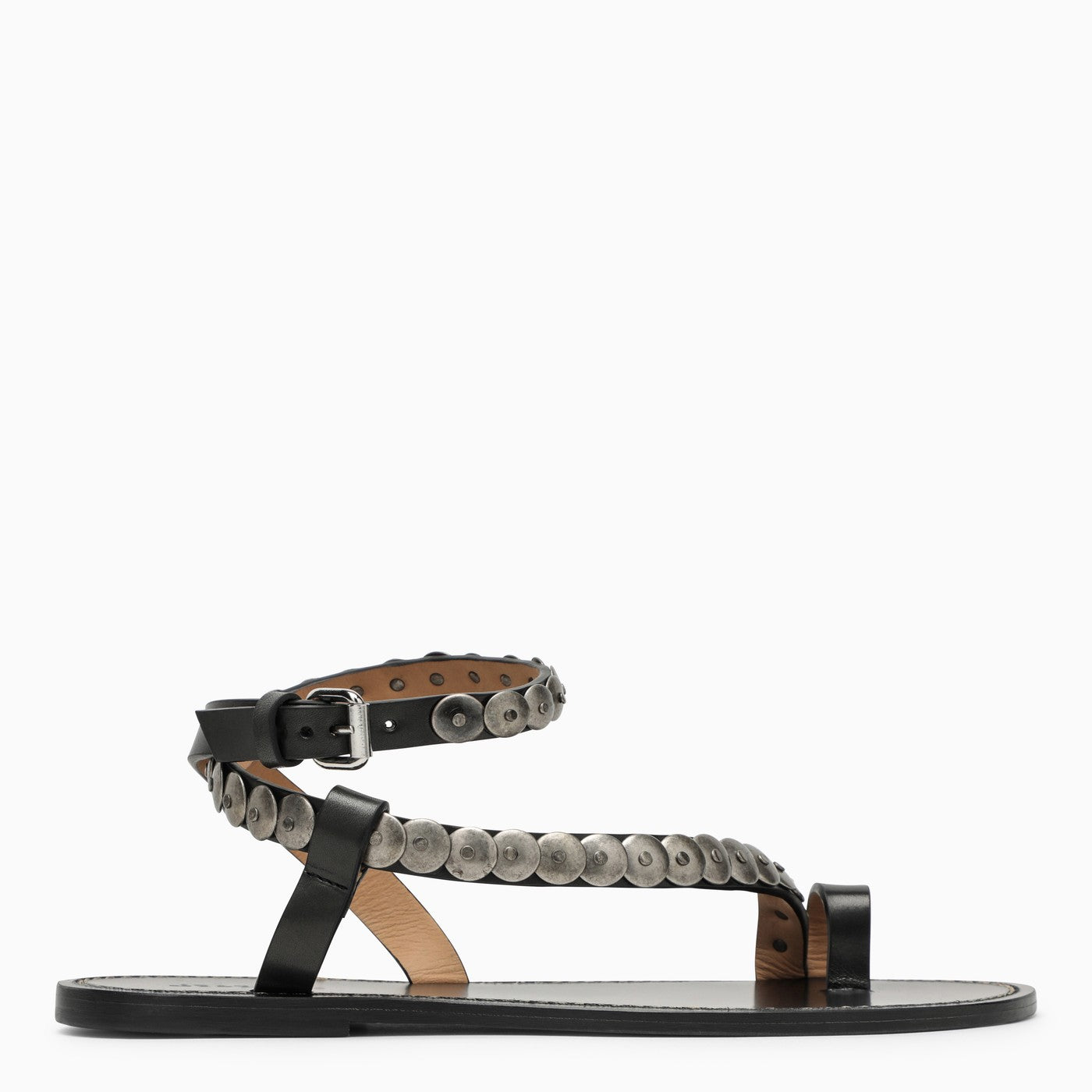 Low sandal from Isabel Marant in black leather featuring all-over stud appliqué, buckle ankle fastening, open round toe and leather sole.