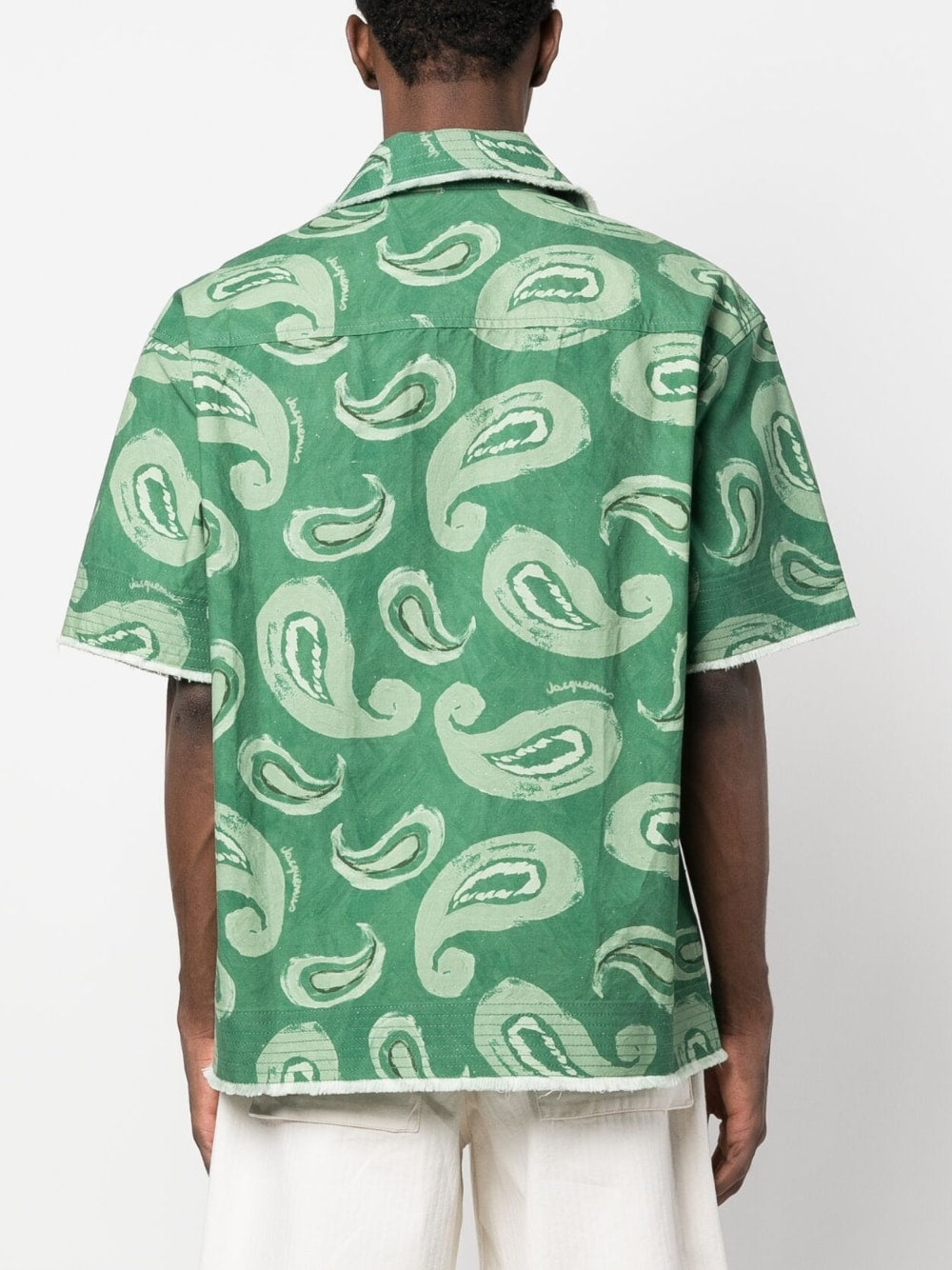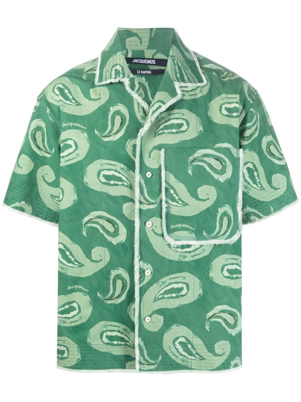 Artichaut paisley-print frayed-edge shirt from Jacquemus featuring green, cotton, paisley print, camp collar, chest patch pocket, front button fastening, short sleeves, frayed edge and straight hem.