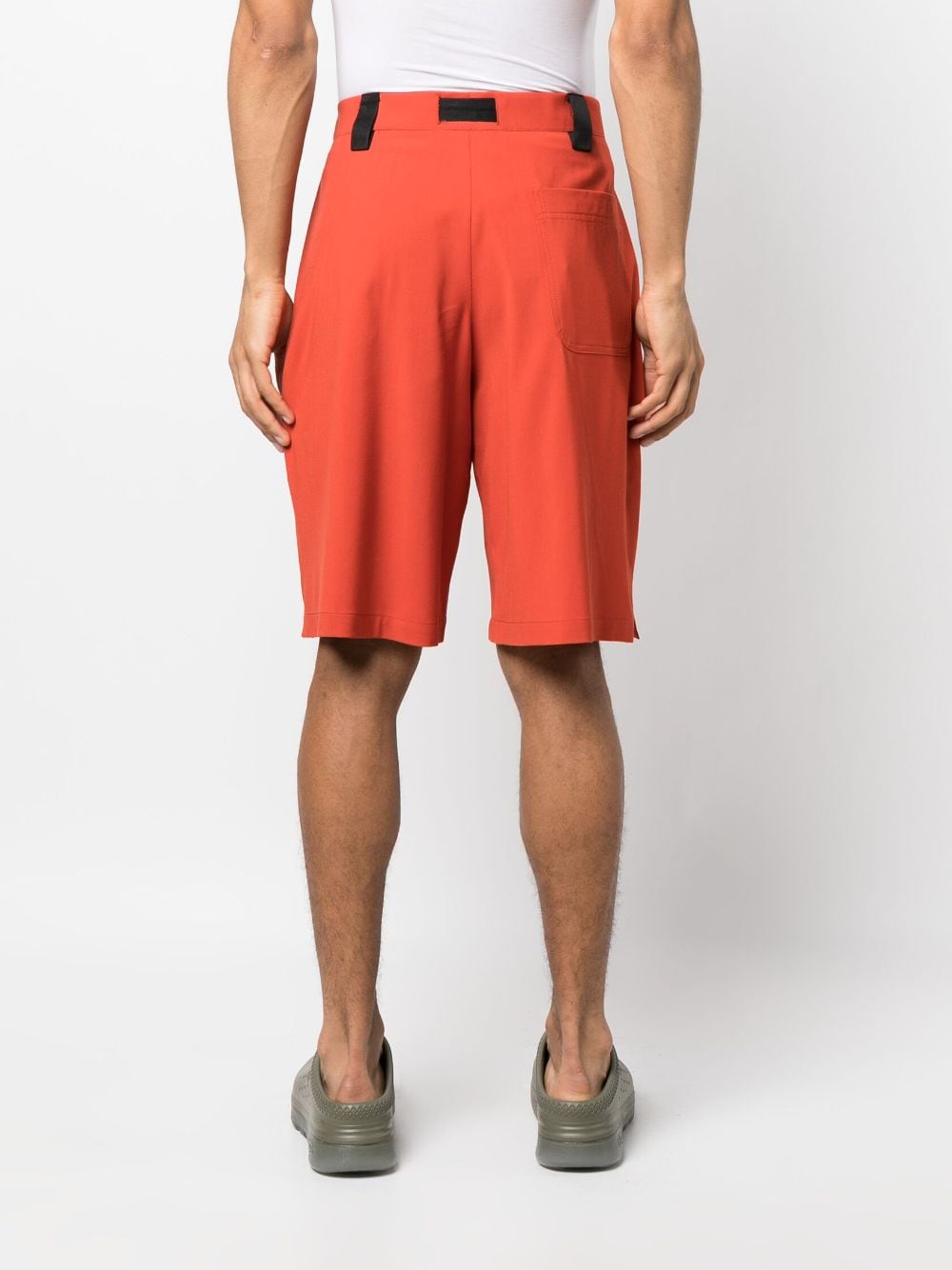 Le Short Meio oversize shorts from Jacquemus featuring terracotta orange, stretch-design, oversize frame, mid-rise, concealed front fastening, belted waist, buckle fastening, belt loops, two diagonal pockets to the sides, rear patch pocket, short side slits and wide leg.