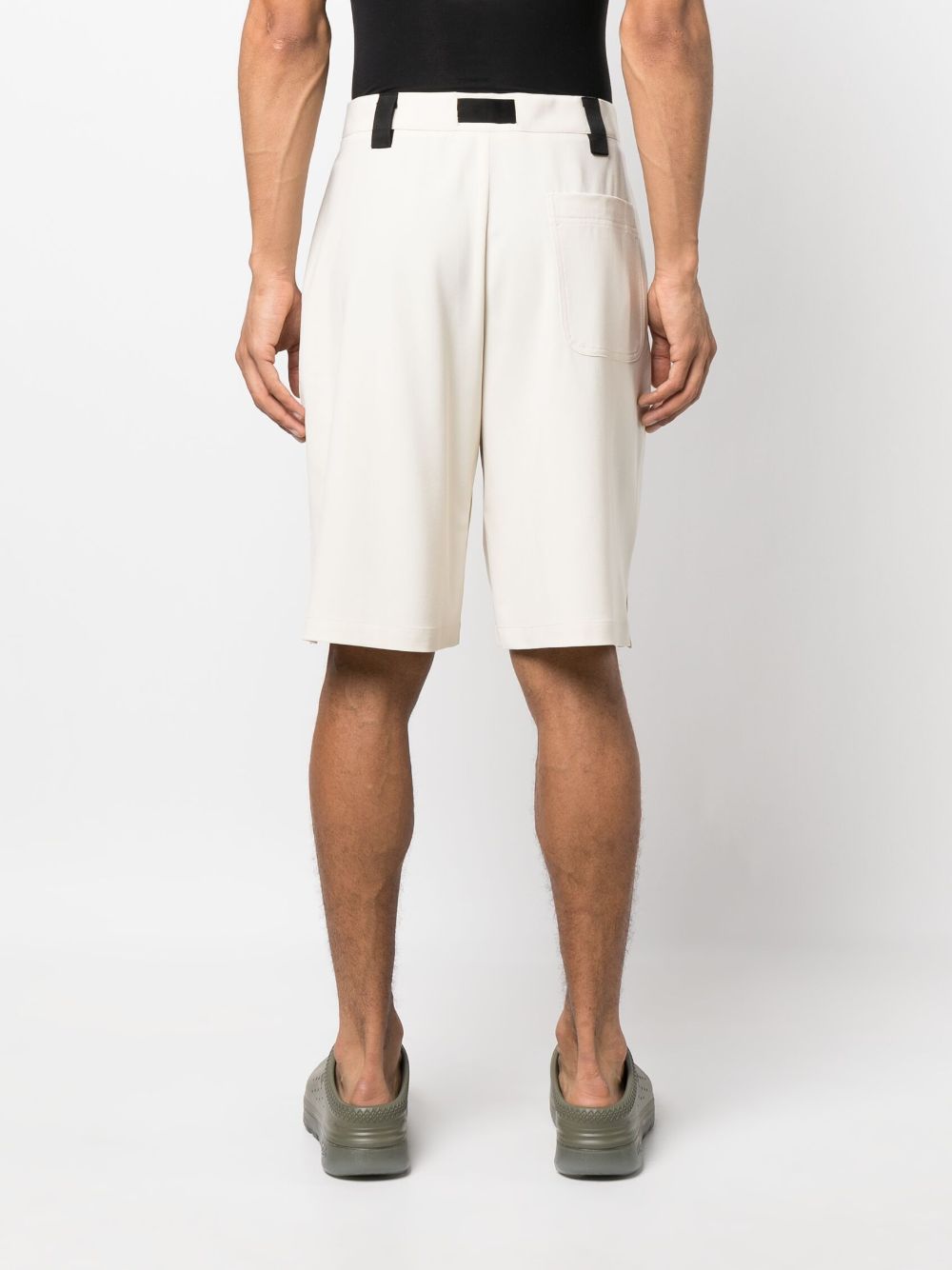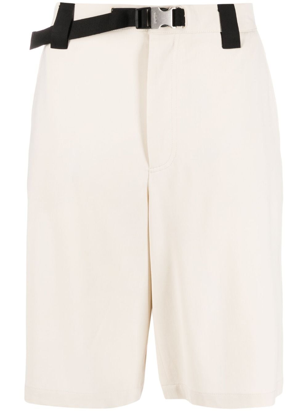 Le Short Meio oversize shorts from Jacquemus featuring milk white, stretch-design, oversize frame, mid-rise, concealed front fastening, belted waist, buckle fastening, belt loops, two diagonal pockets to the sides, rear patch pocket, short side slits and wide leg.