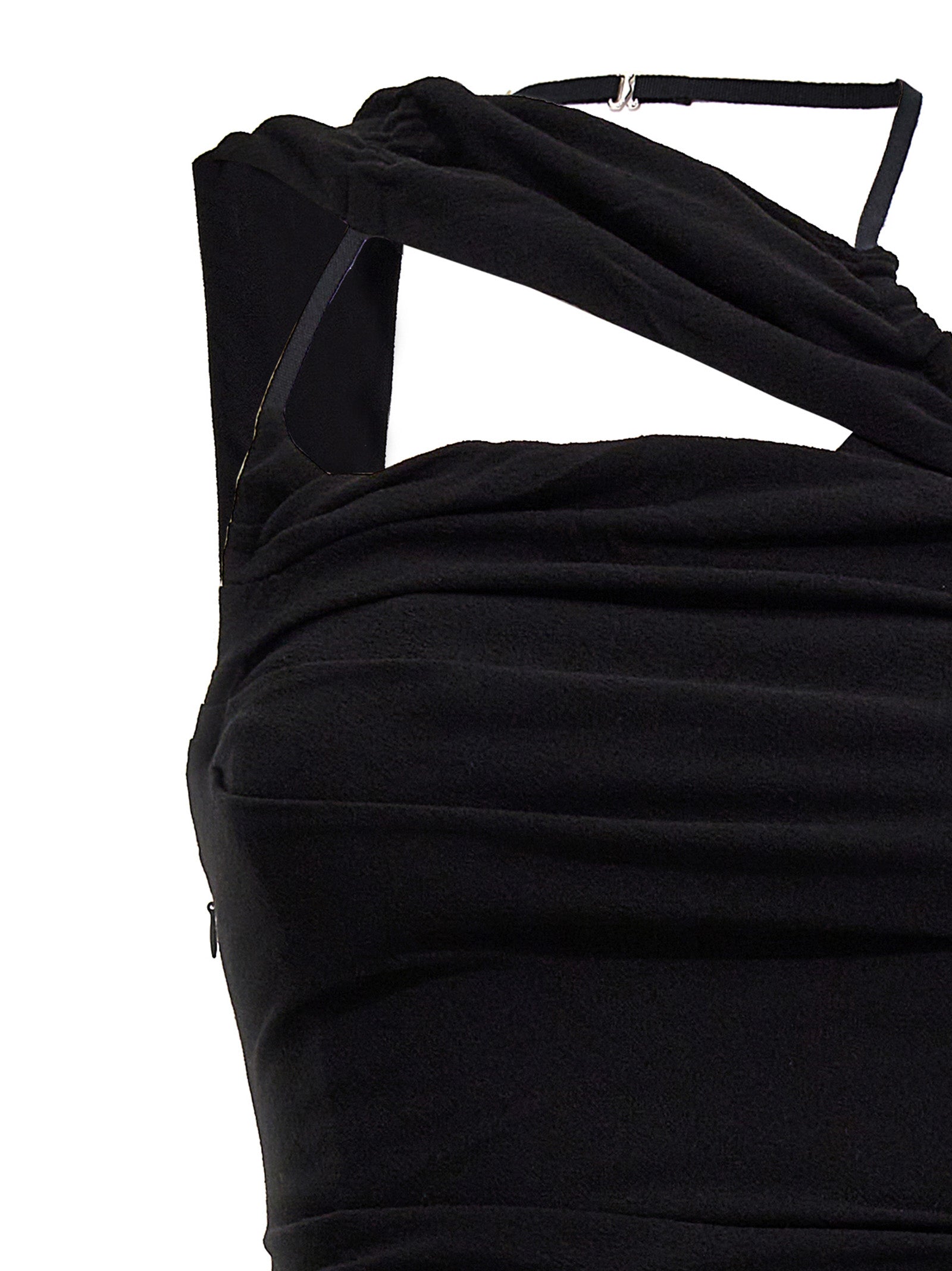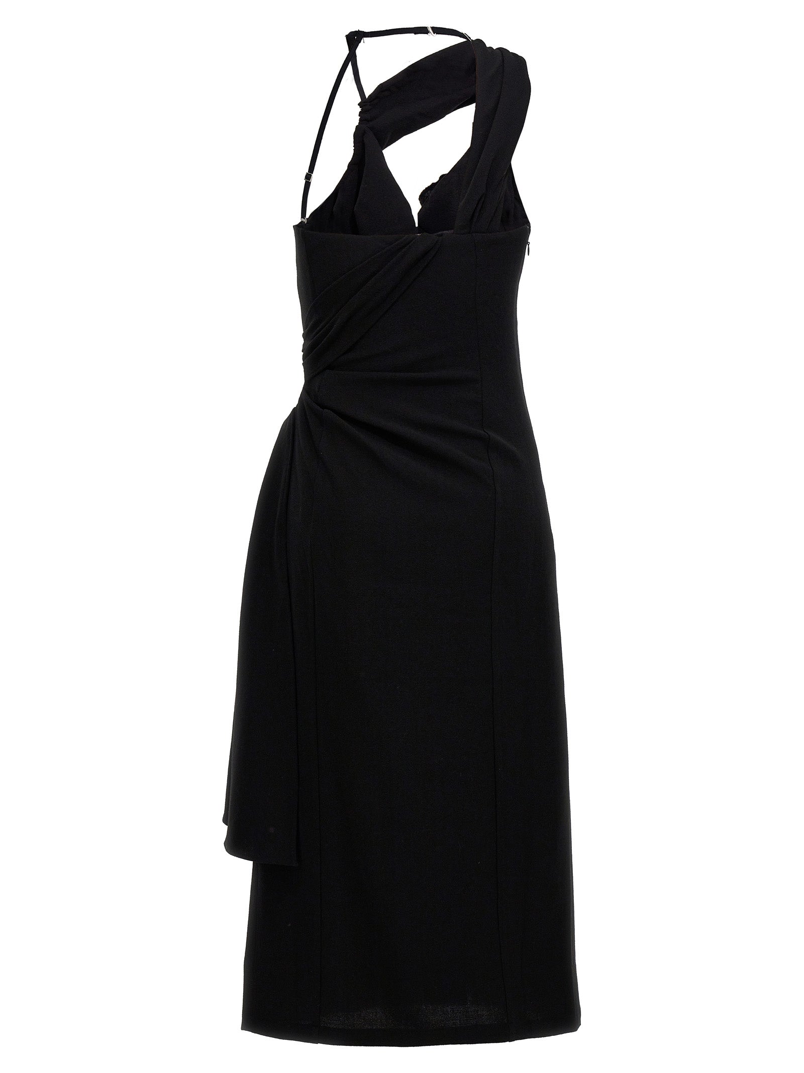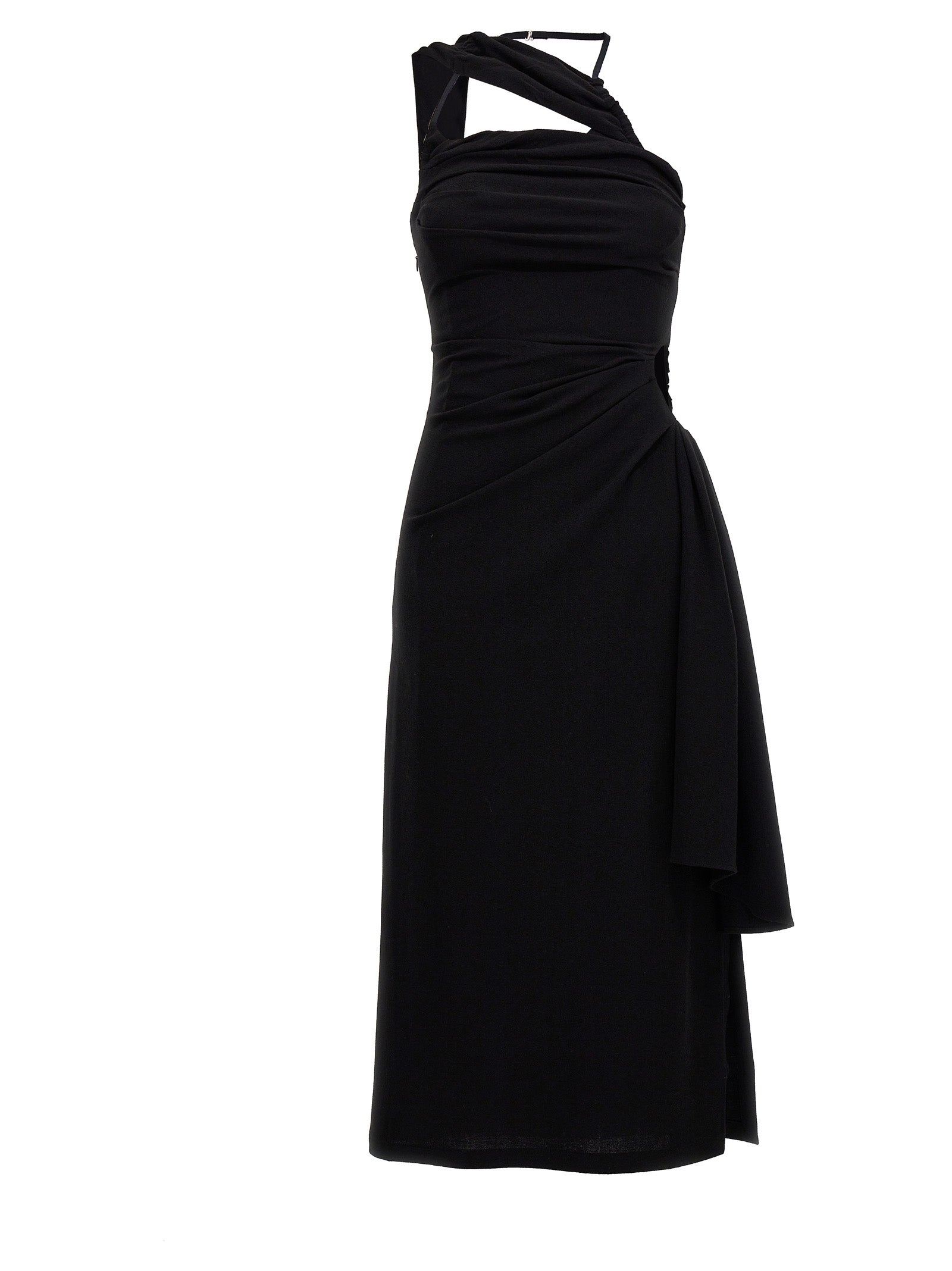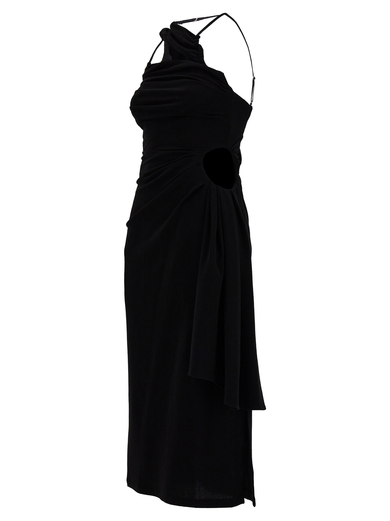 ‘Abanada' asymmetrical stretch crêpe wool draped dress featuring a midi length, adjustable shoulder straps,sash draped on the chest, cut out details on the left side, a bottom left split and a side zip closure.