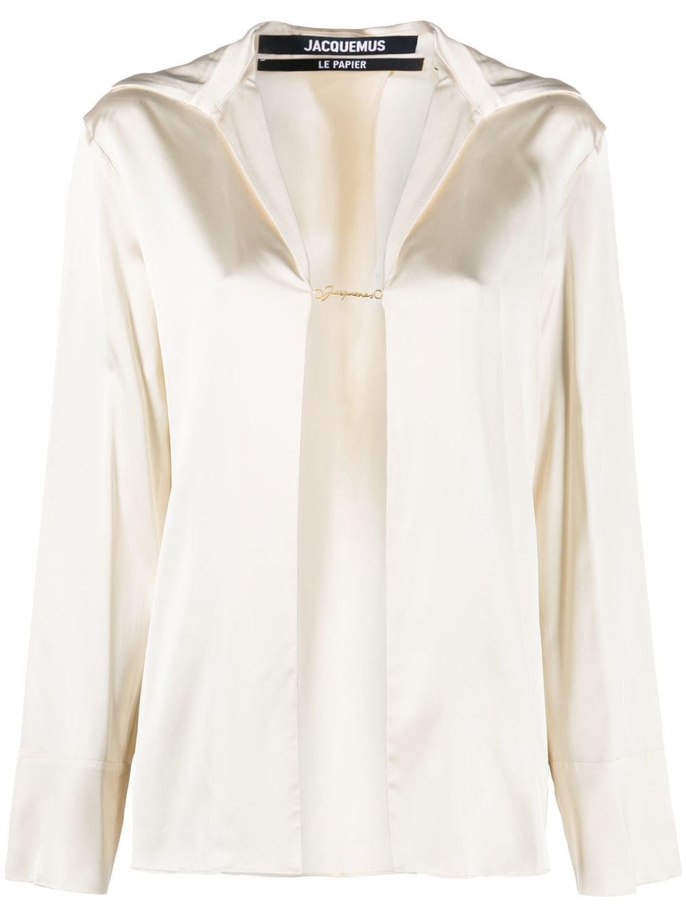 Notte logo plaque blouse from Jacquemus featuring off-white, V-neck, logo plaque and long sleeves.